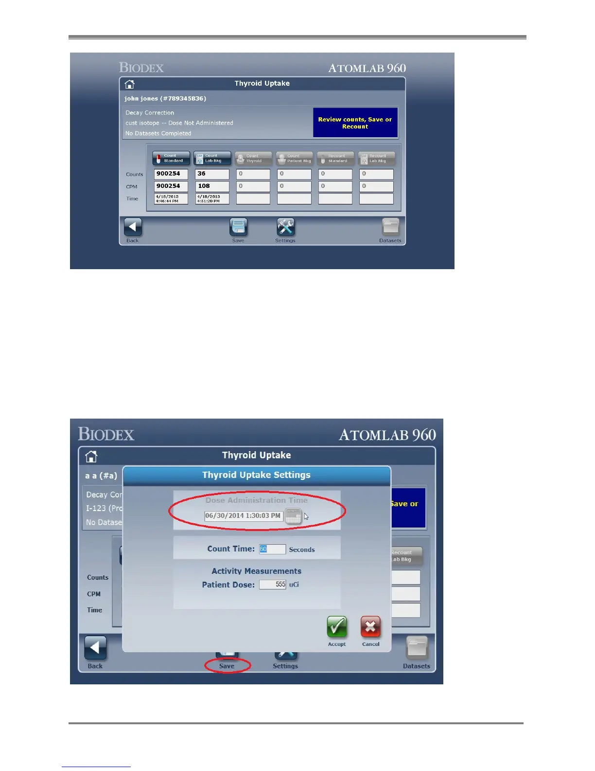administration time by selecting the <Settings> icon on the Thyroid Uptake screen and