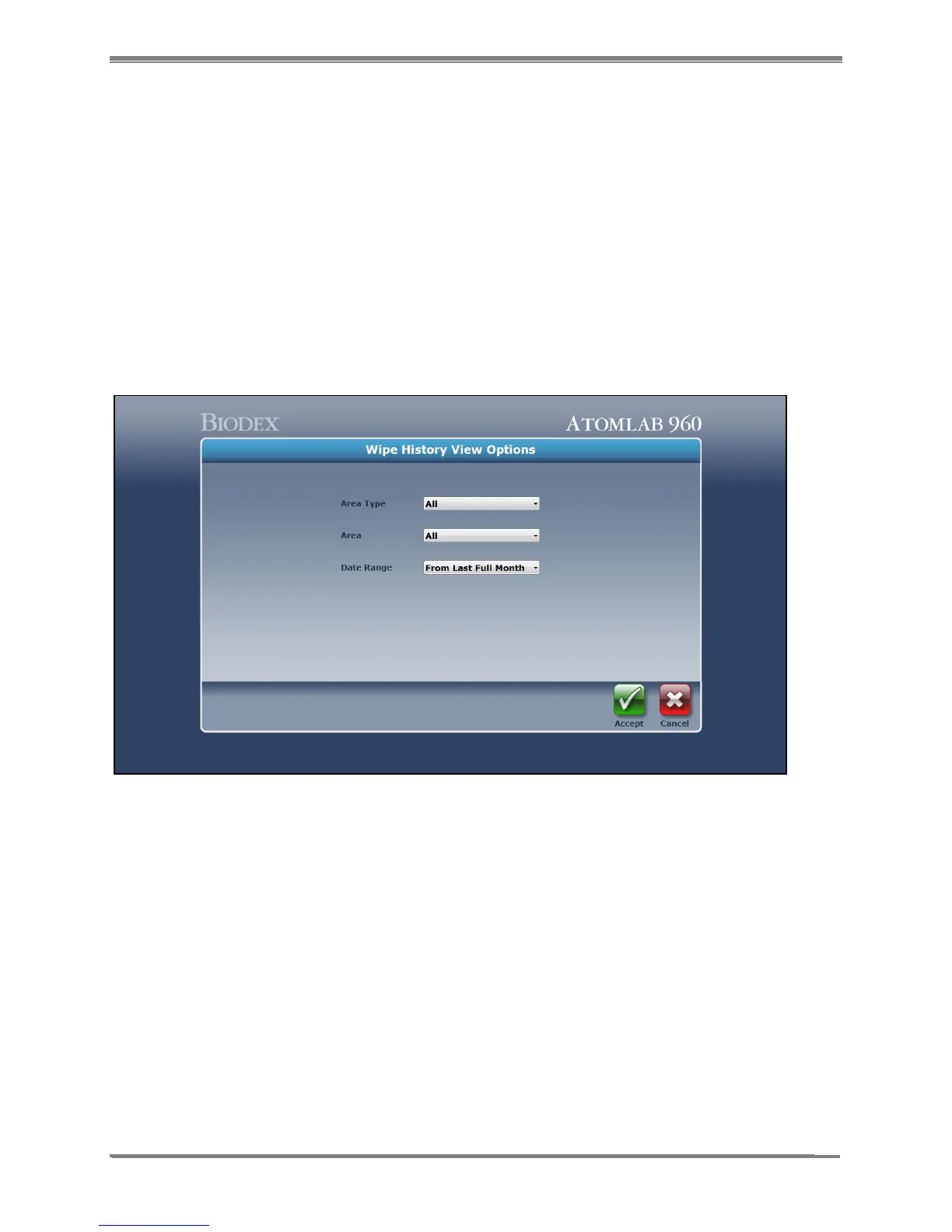 or “all” areas, and the date range to be displayed as the results of the testing on the Wipe