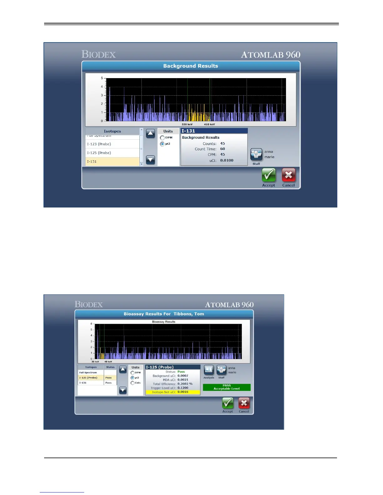 Figure 9.4. Bioassay Counting Results screen for Staff Member.