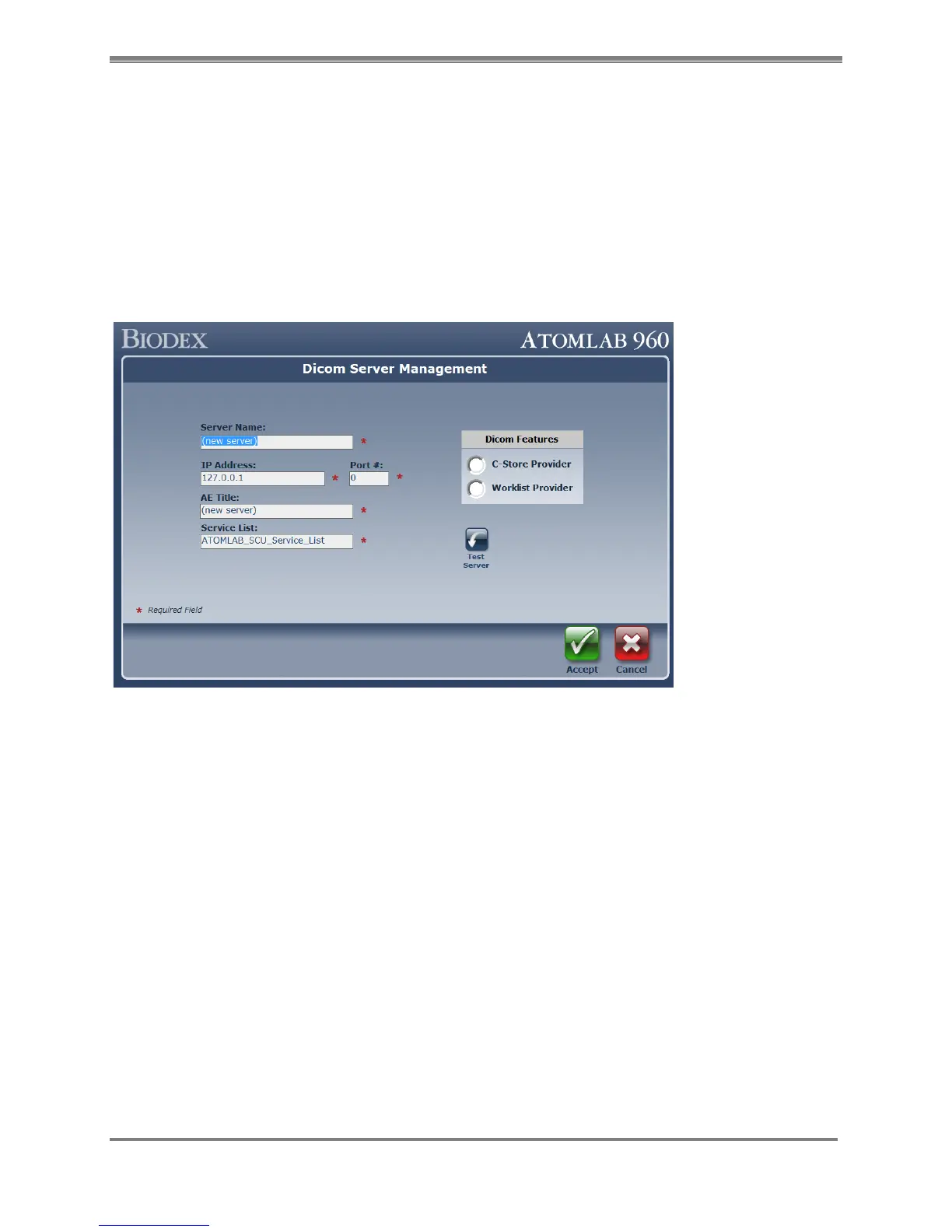“DICOM Server Management” screen. Type all required information on that screen.