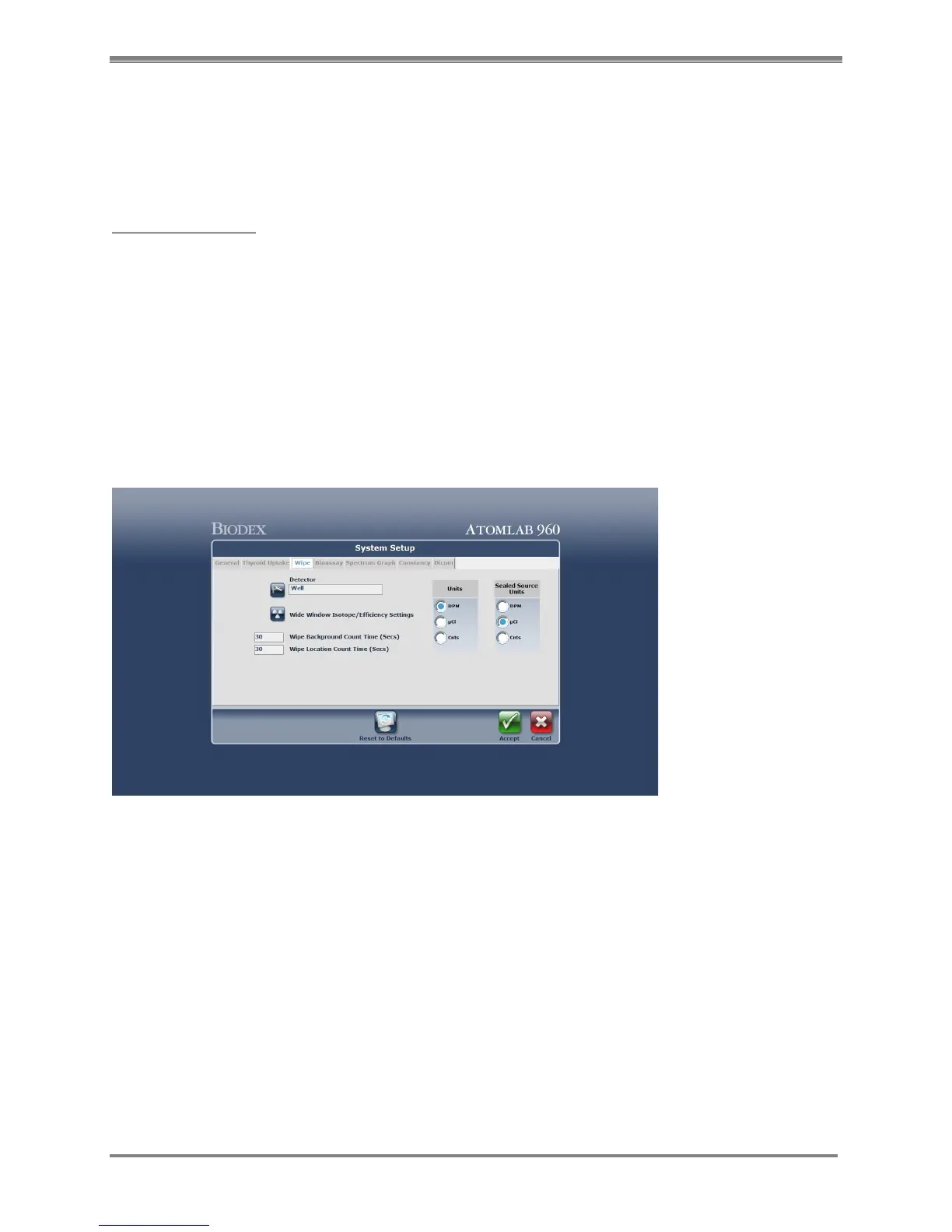 6. Select the default units for Wipe Test results
