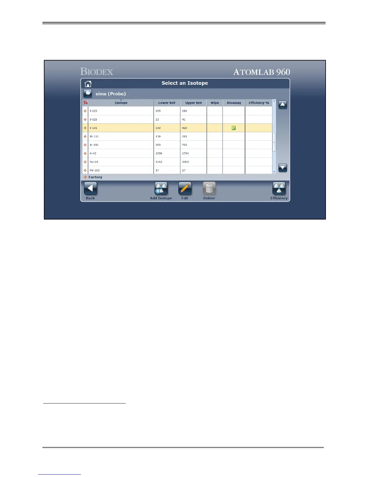 The Atomlab 960 isotope list comes with 29 preset isotopes. For these factory isotopes, Lower