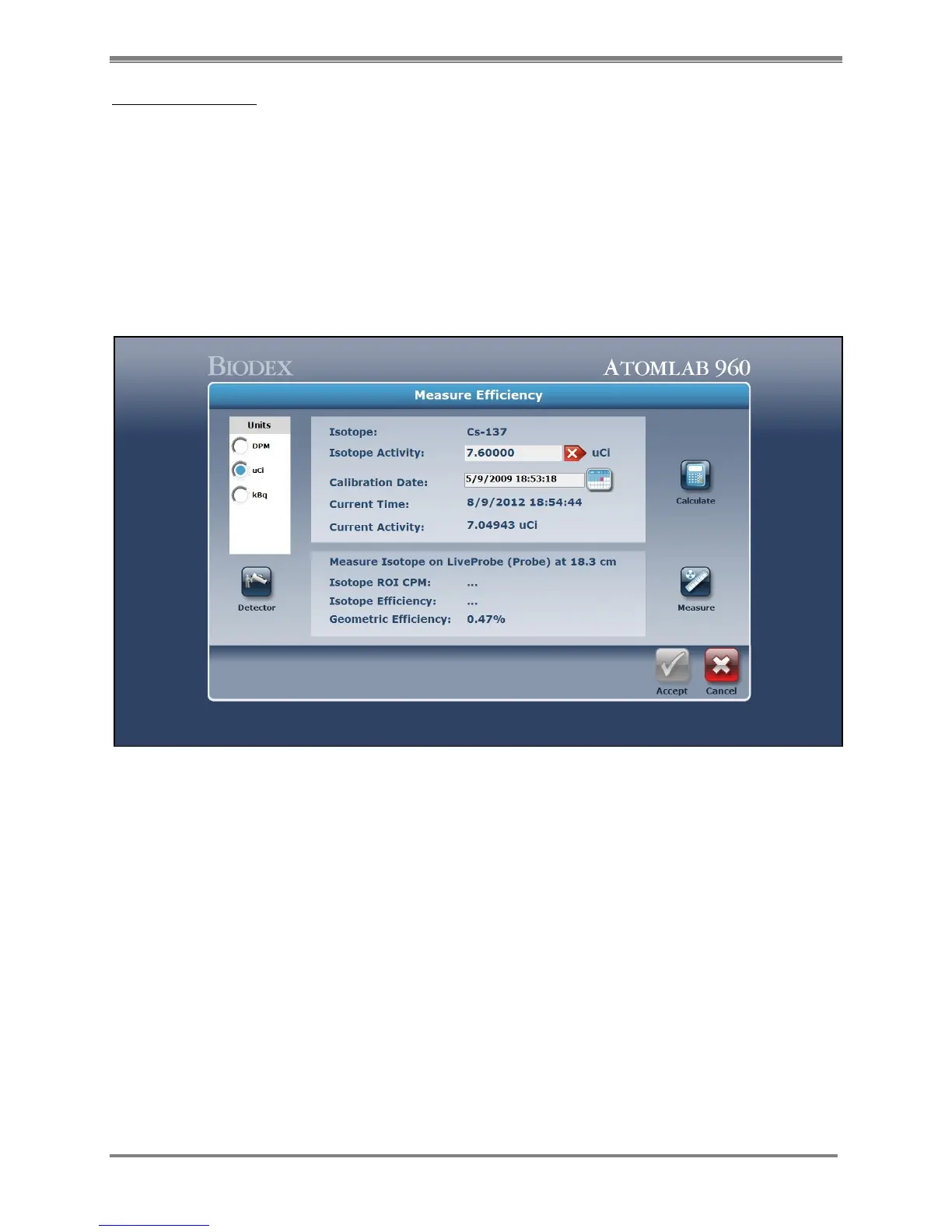 The Detector Efficiency Options screen is now displayed. The selected isotope is displayed
