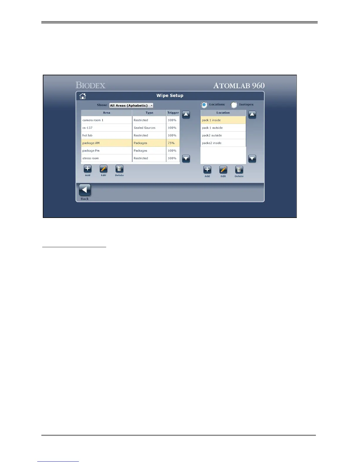 2. To add a wipe area, select <Add> under the Areas Section. The Add Wipe Area screen is now