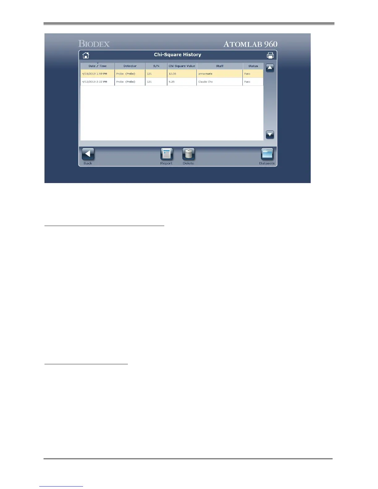 1. Select <Chi Square History> from the Quality Assurance Page. The Chi Square History screen