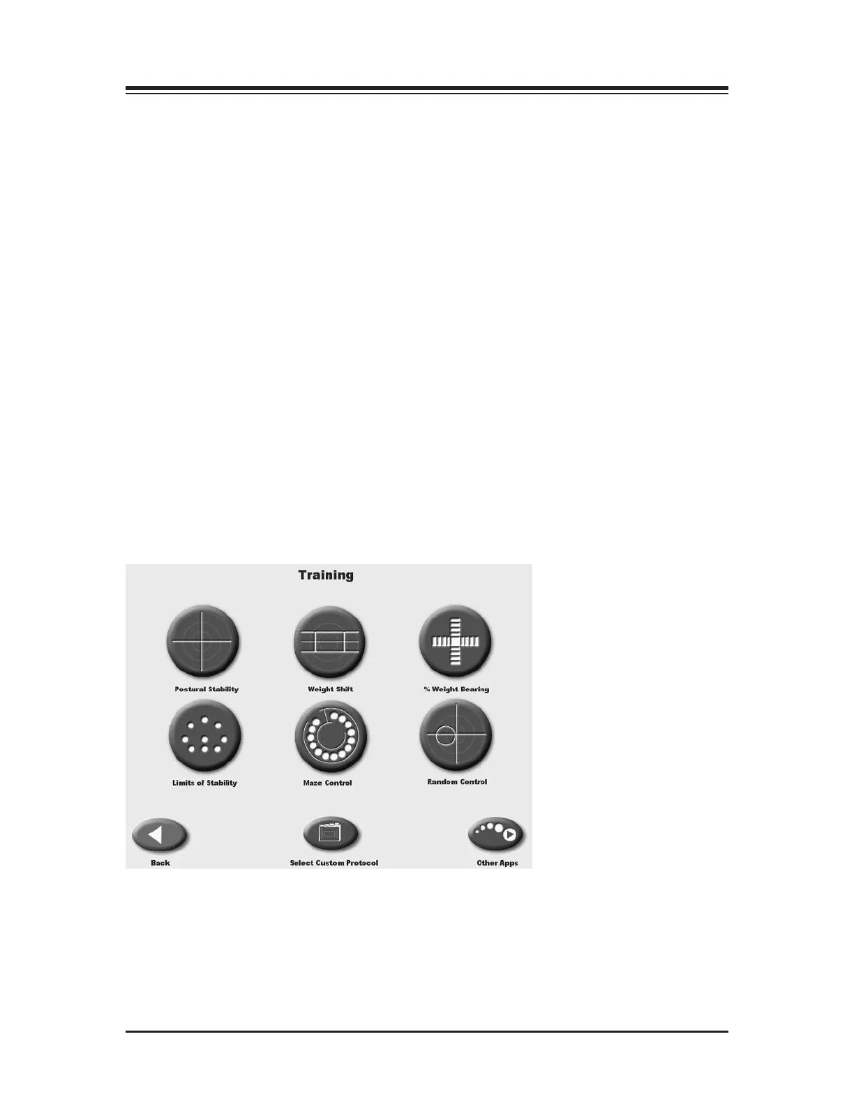 Figure 7.1. The Training Menu screen provides access to the Postural Stability, Limits of Stability,
