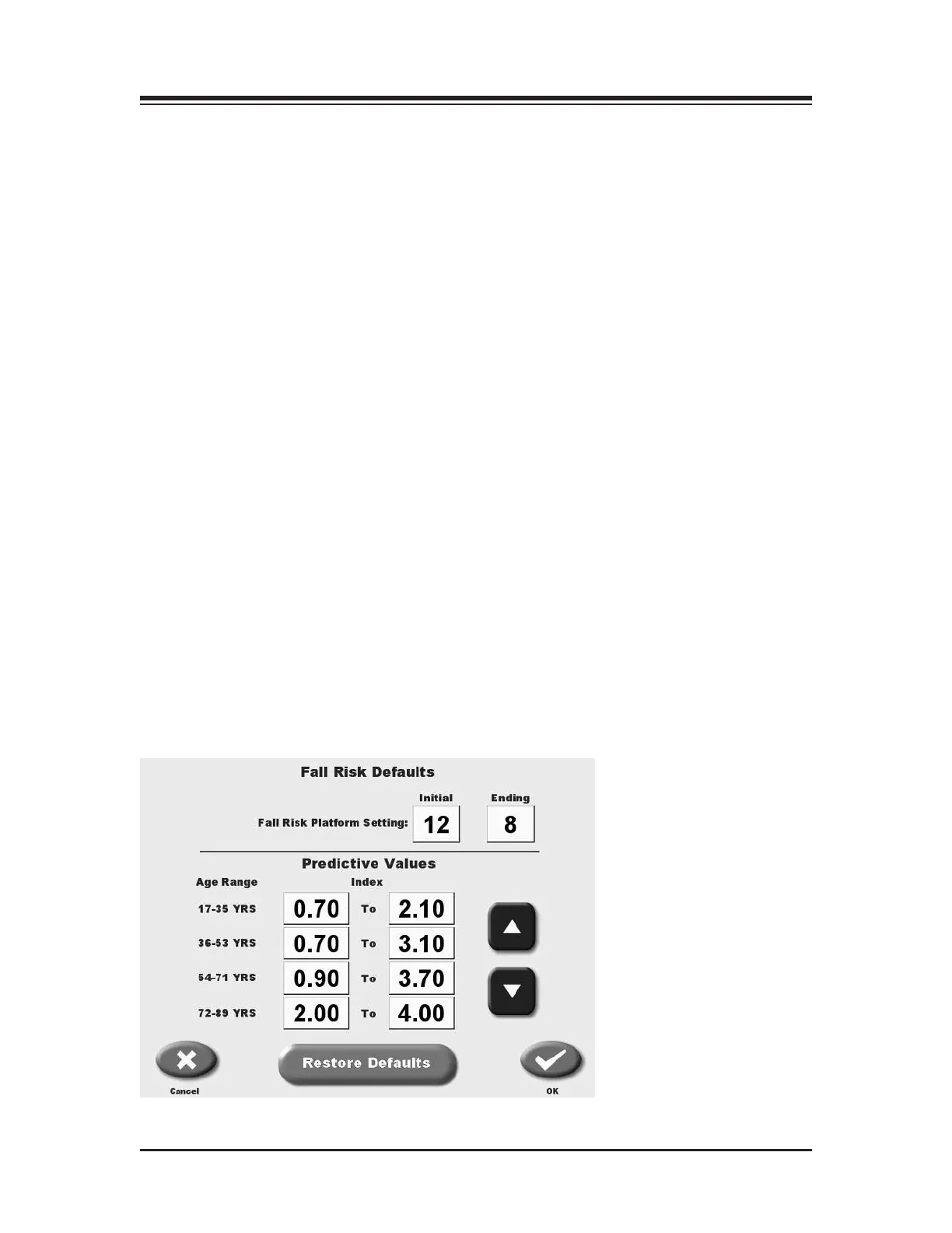 At the Fall Risk Default Settings screen, users can set the default Fall Risk Platform settings,