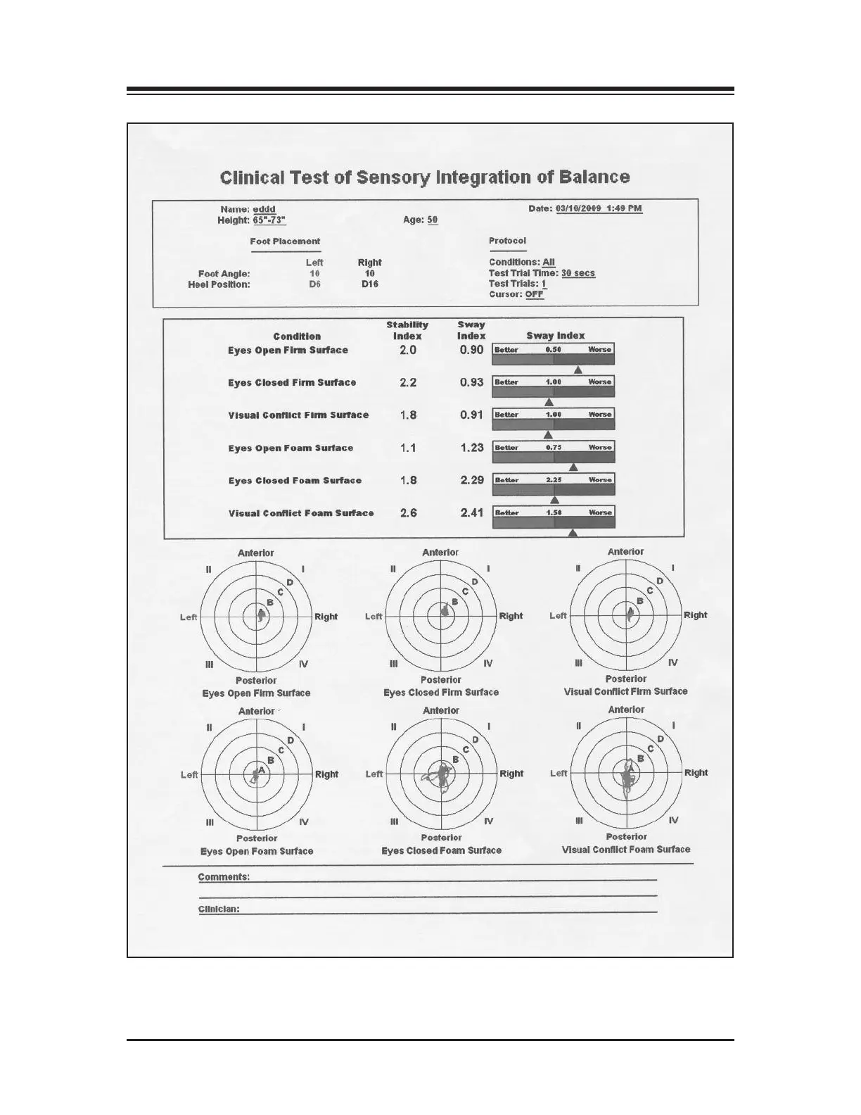 Figure 8.3. CTSIB Sample report, 6 conditions. Note that if the patient failed to complete a condition, it