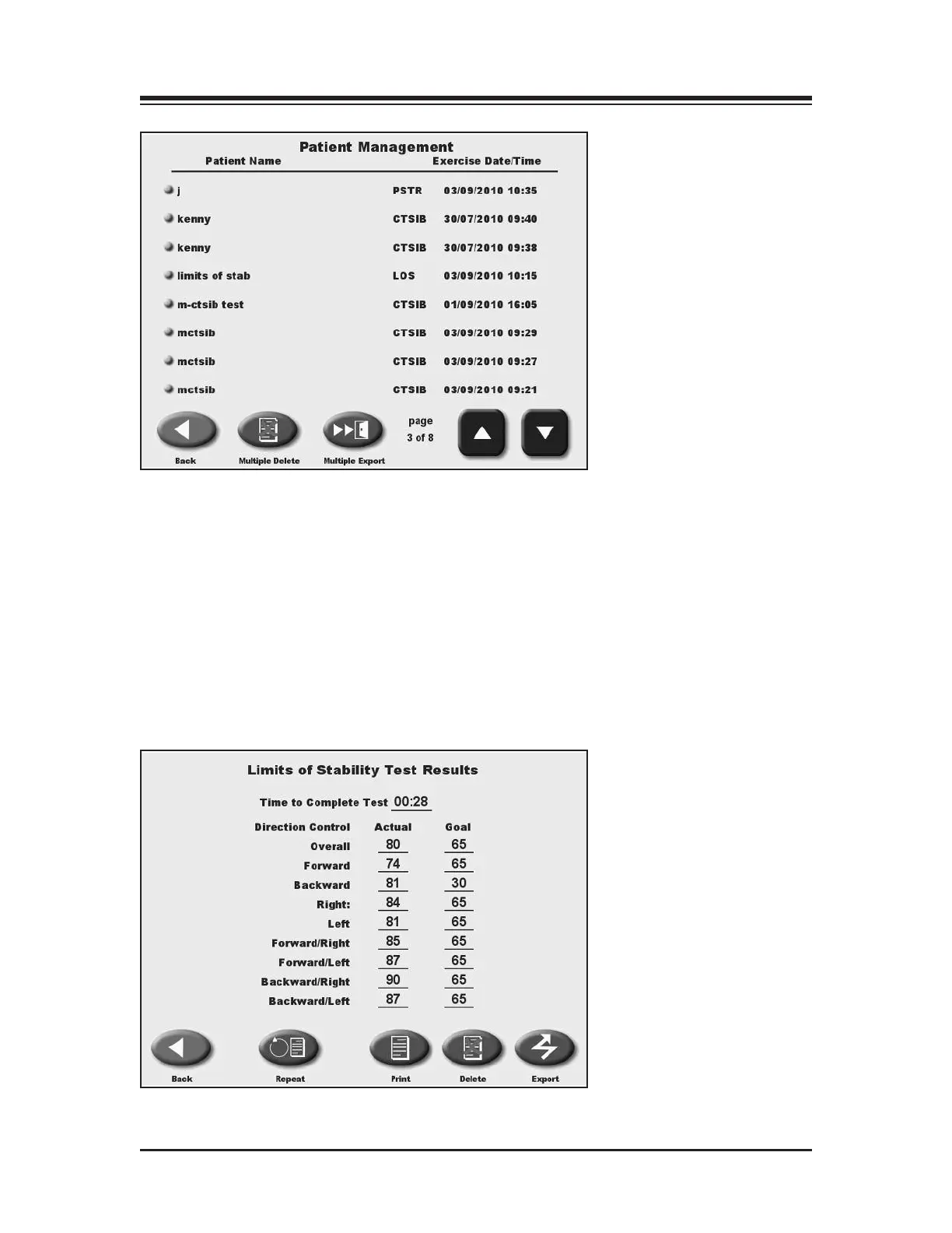 To repeat any saved test or exercise session, touch <Repeat> on the on-screen report. The system