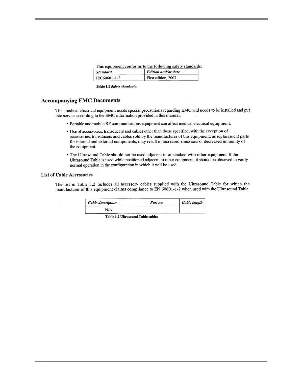 biodex ECHO PRO - Conformance to Standards and EMC Information; Accompanying EMC Documents; List of Cable Accessories