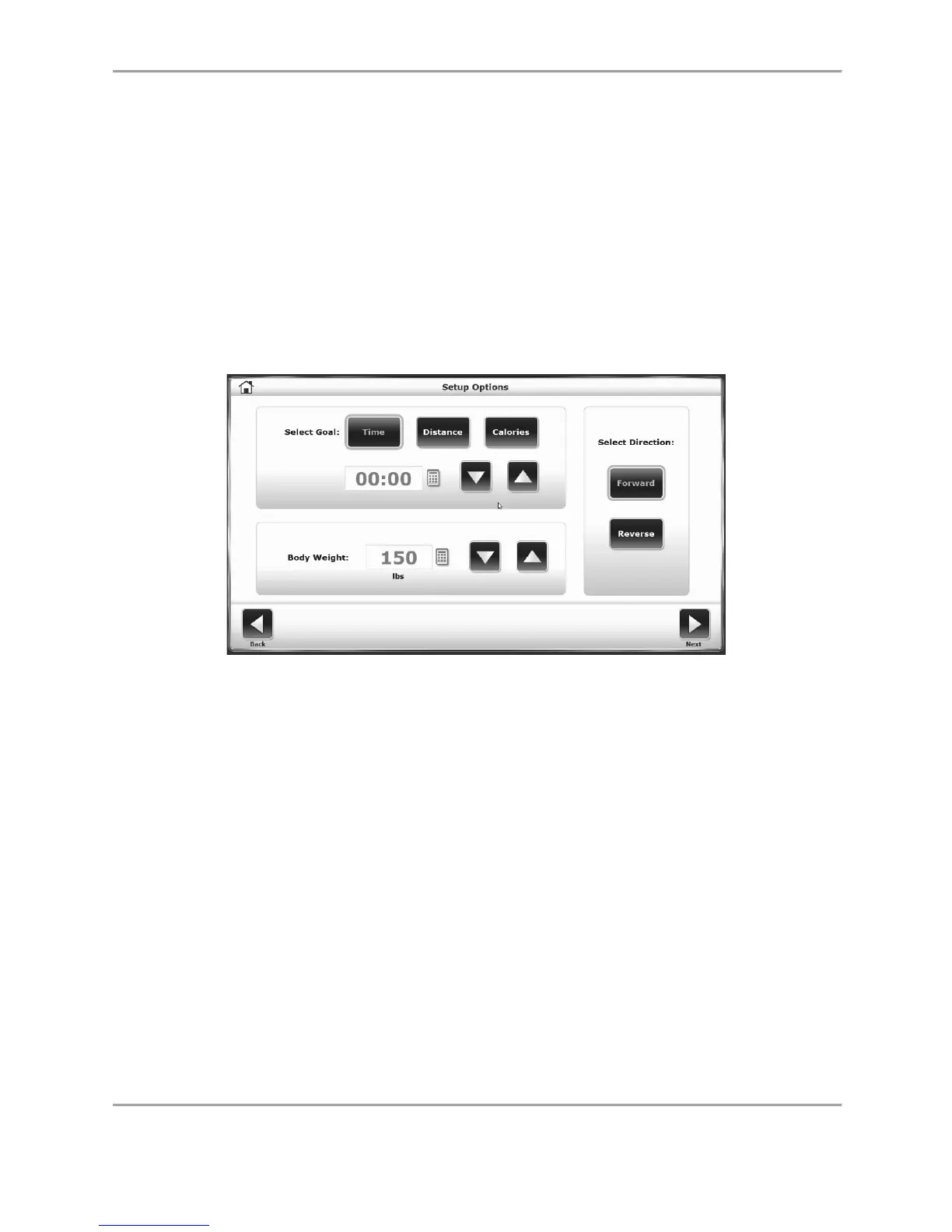 1. At the treadmill Opening Menu select <Manual Start>. The Setup Options screen is