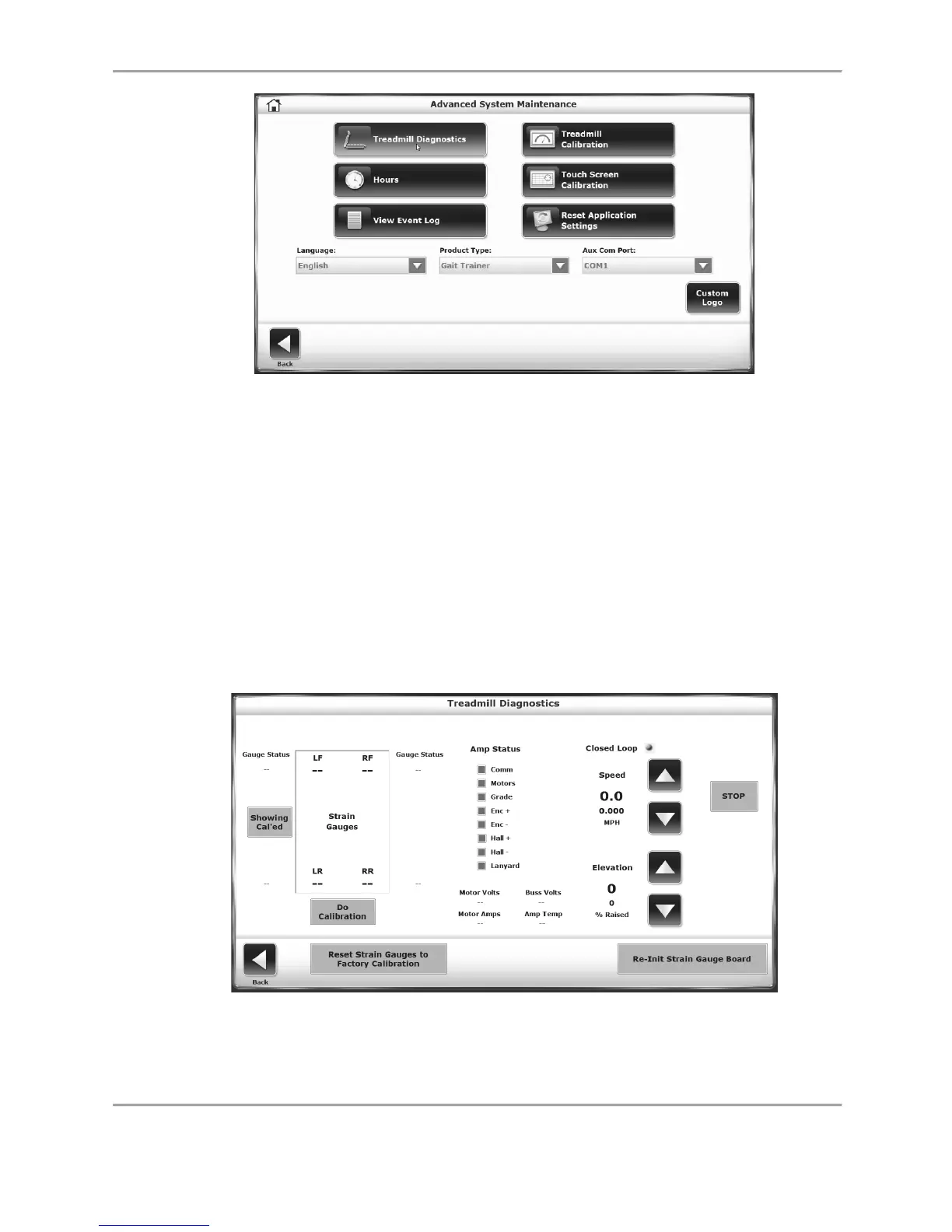 Treadmill Diagnostics: The Treadmill Diagnostics screen allows the user to conduct some