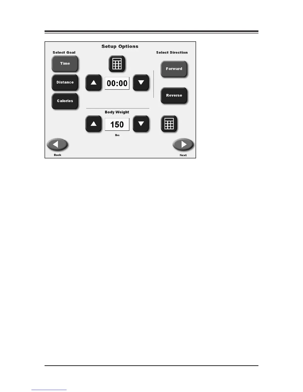 of operation prompts the clinician to enter the patient’s body weight, select the treadbelt direction,