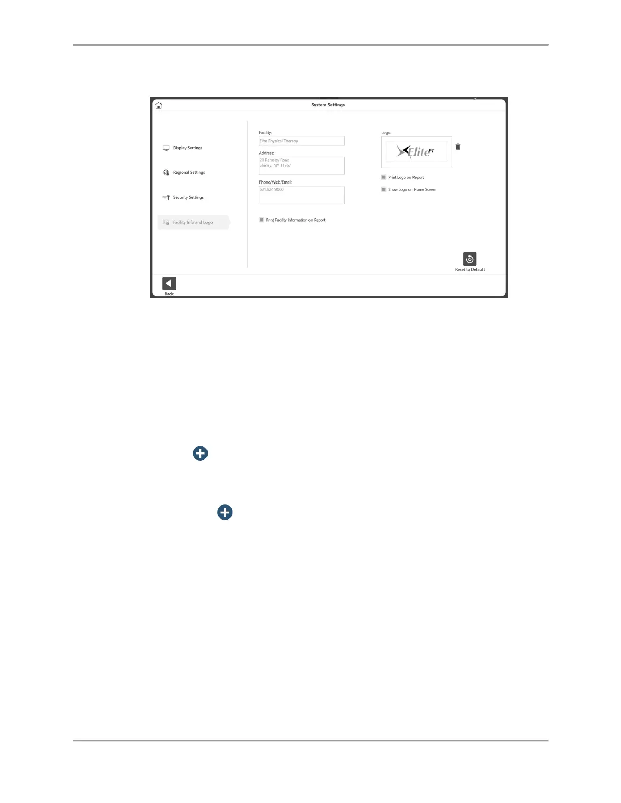 3. Select Facility Info and Logo. The following settings can be adjusted: