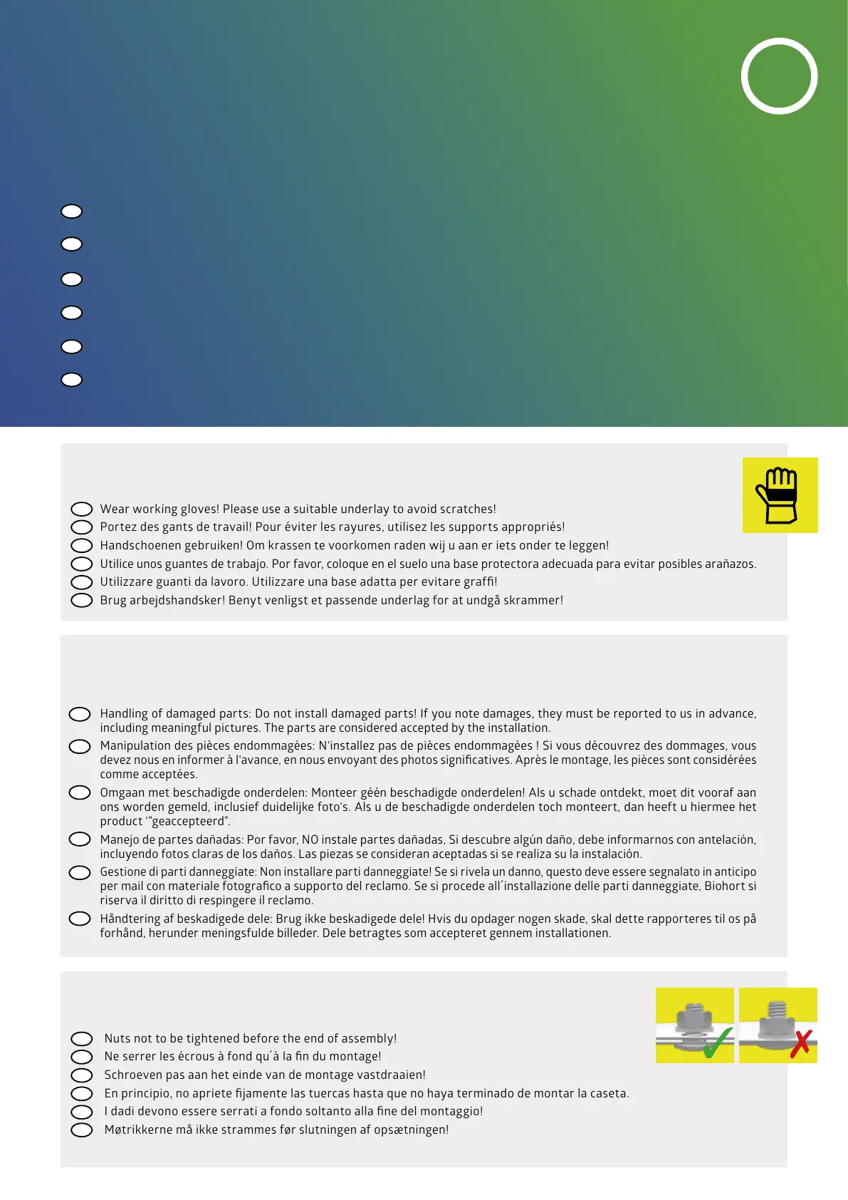 Handschoenen gebruiken! Om krassen te voorkomen raden wij u aan er iets onder te leggen!