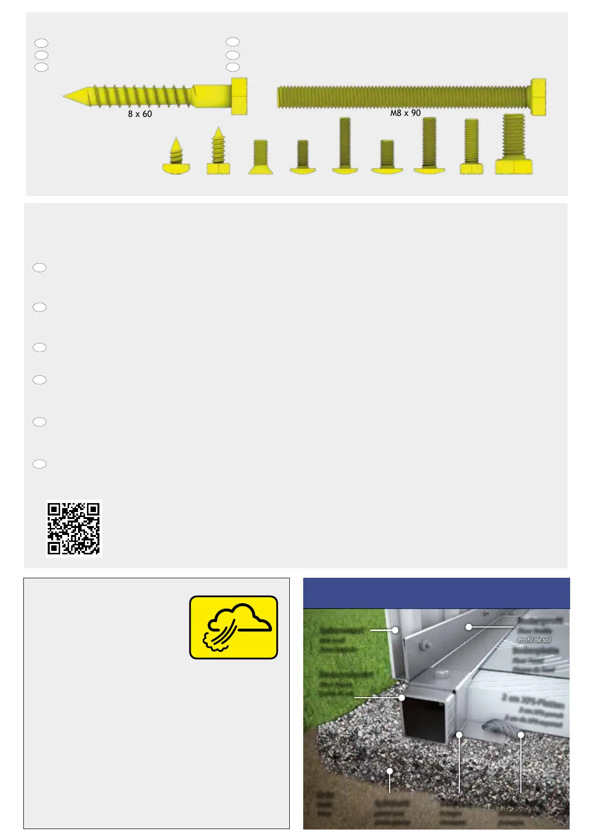 Lors de la réalisation de la fondation, veillez à ce que l´eau de pluie ne puisse pas pénétrer dans l´abri ou par les côtés sous les profils de
