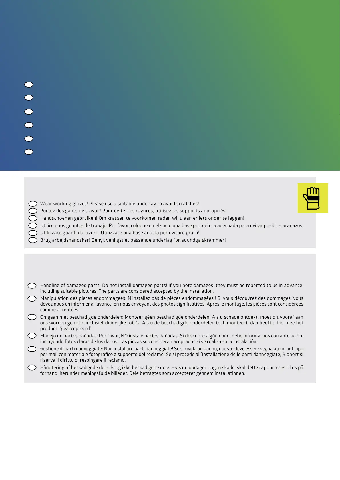 Handling of damaged parts: Do not install damaged parts! If you note damages, they must be reported to us in advance,