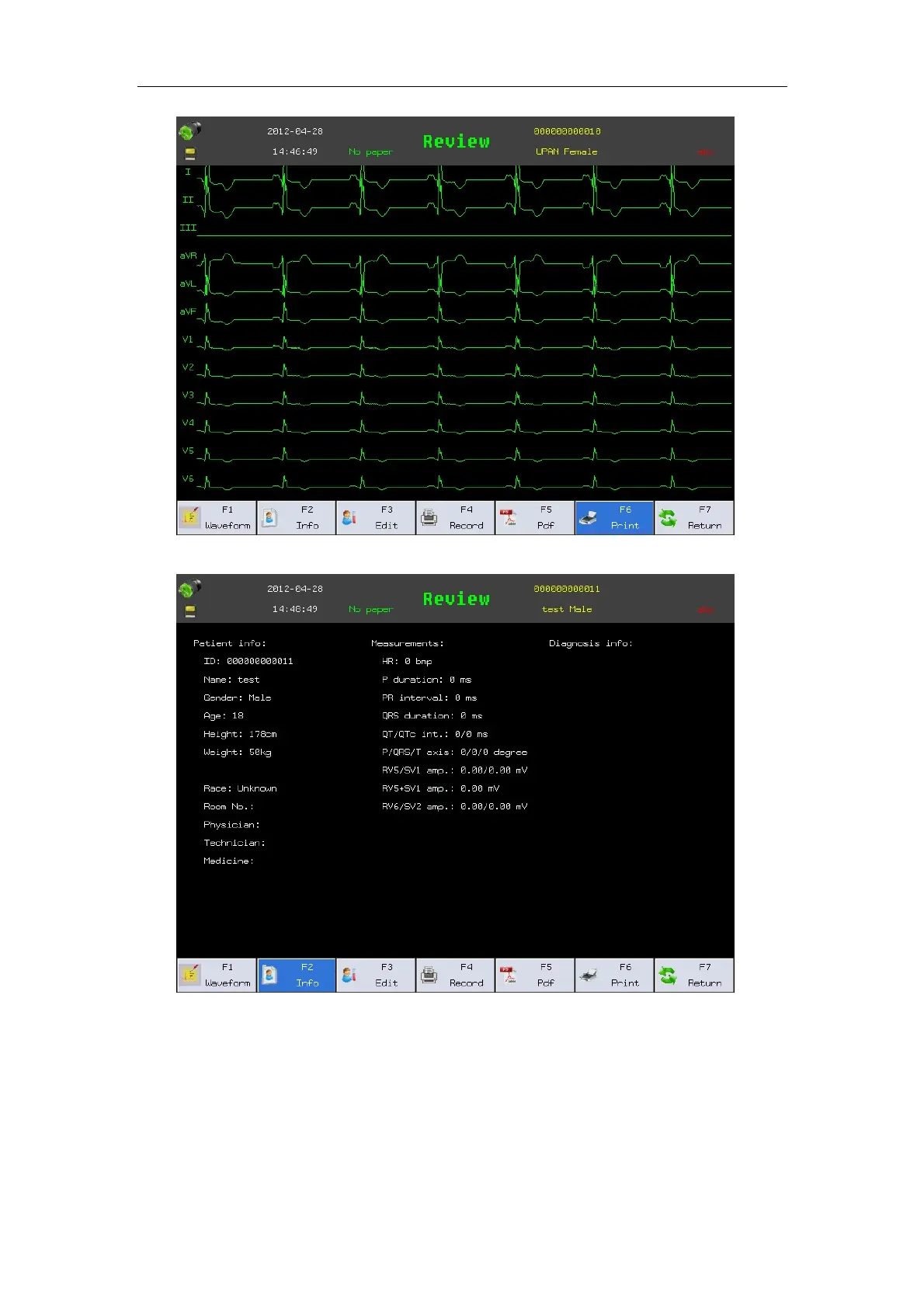 ——Select【Info】: Can display patient info, ECG measure result, ECG