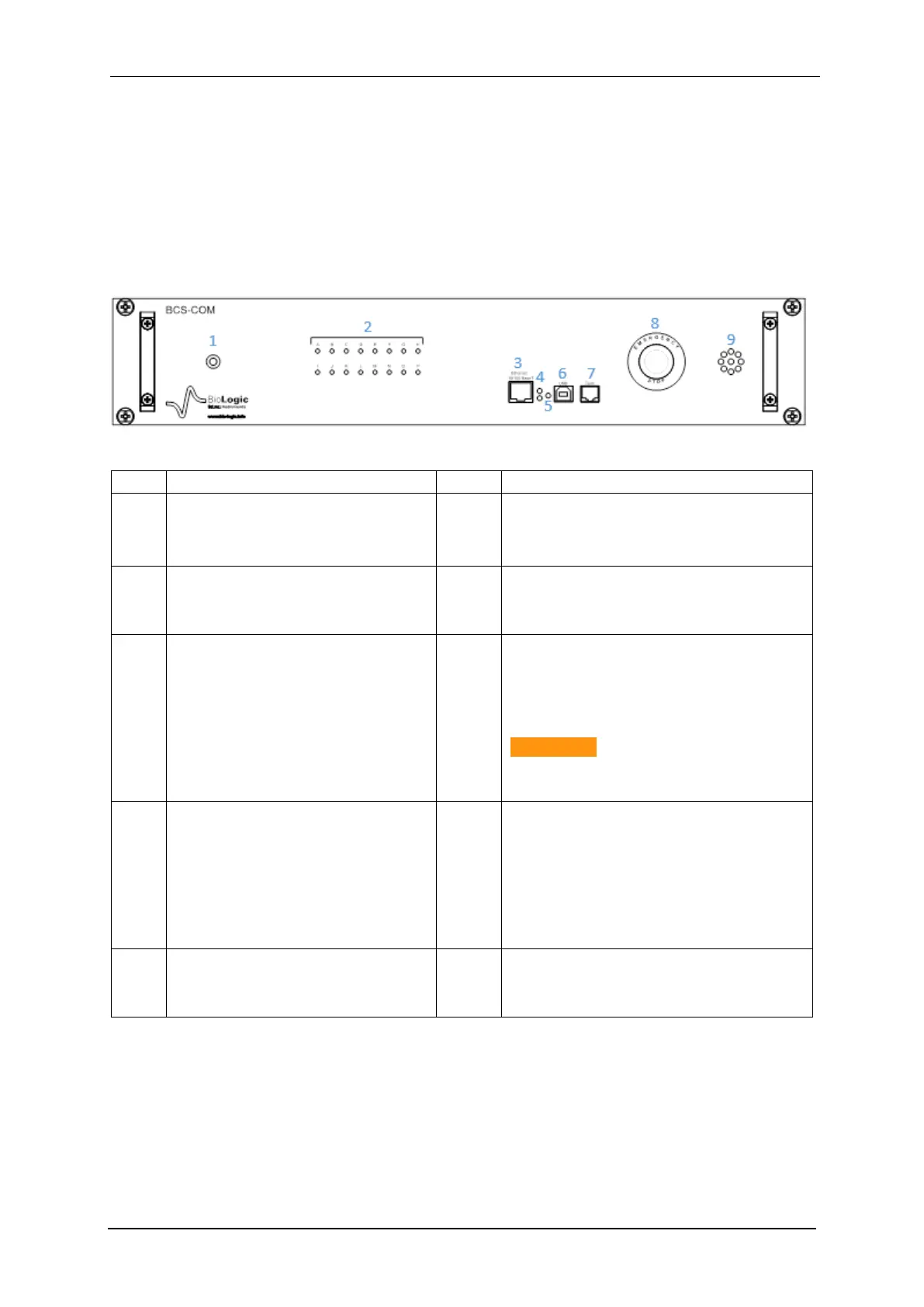 Table 1: Detailed BCS-COM front panel description