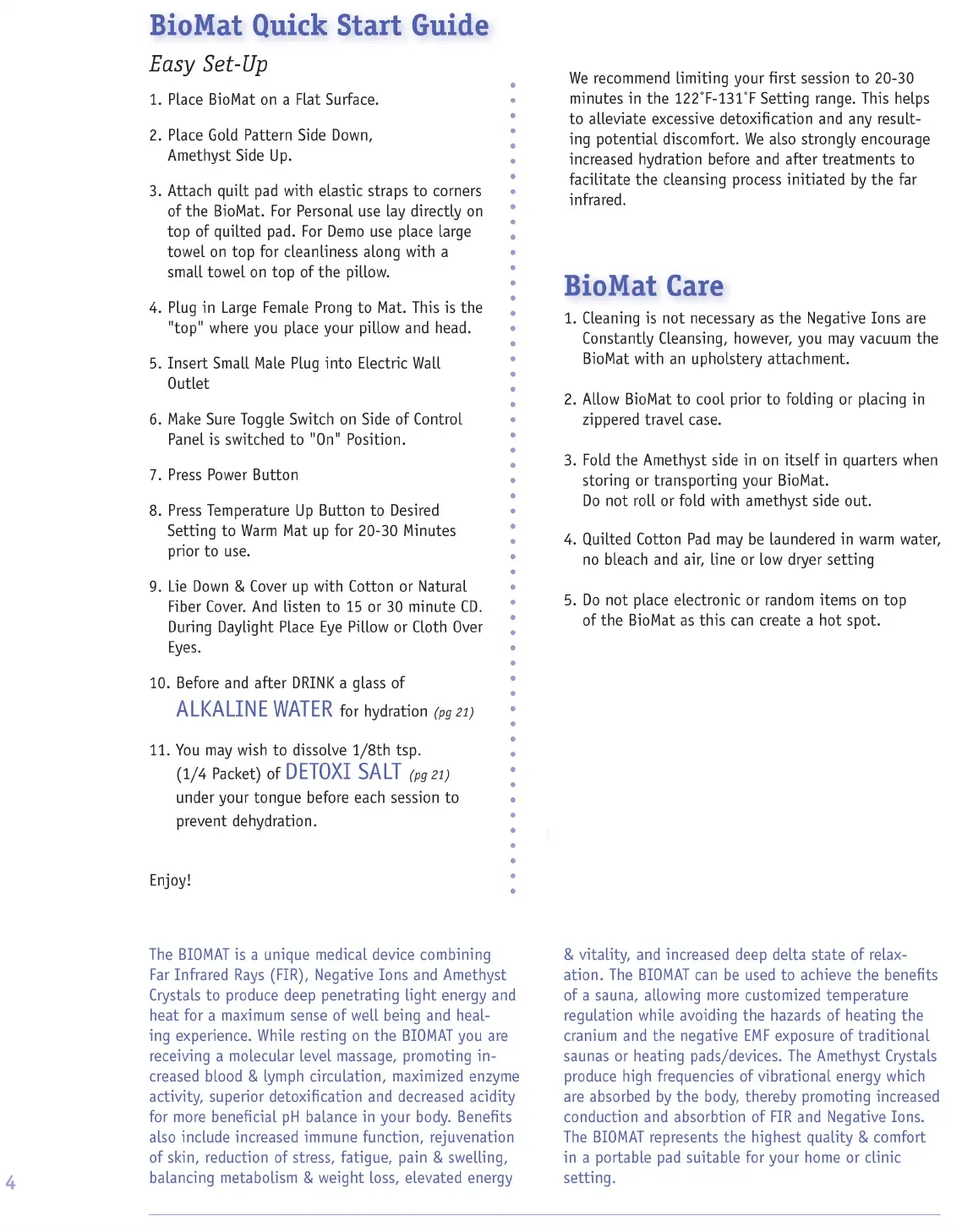 BioMat Professional - BioMat Quick Start & Care; Easy Set-Up Instructions; Hydration and Detox; BioMat Cleaning and Storage