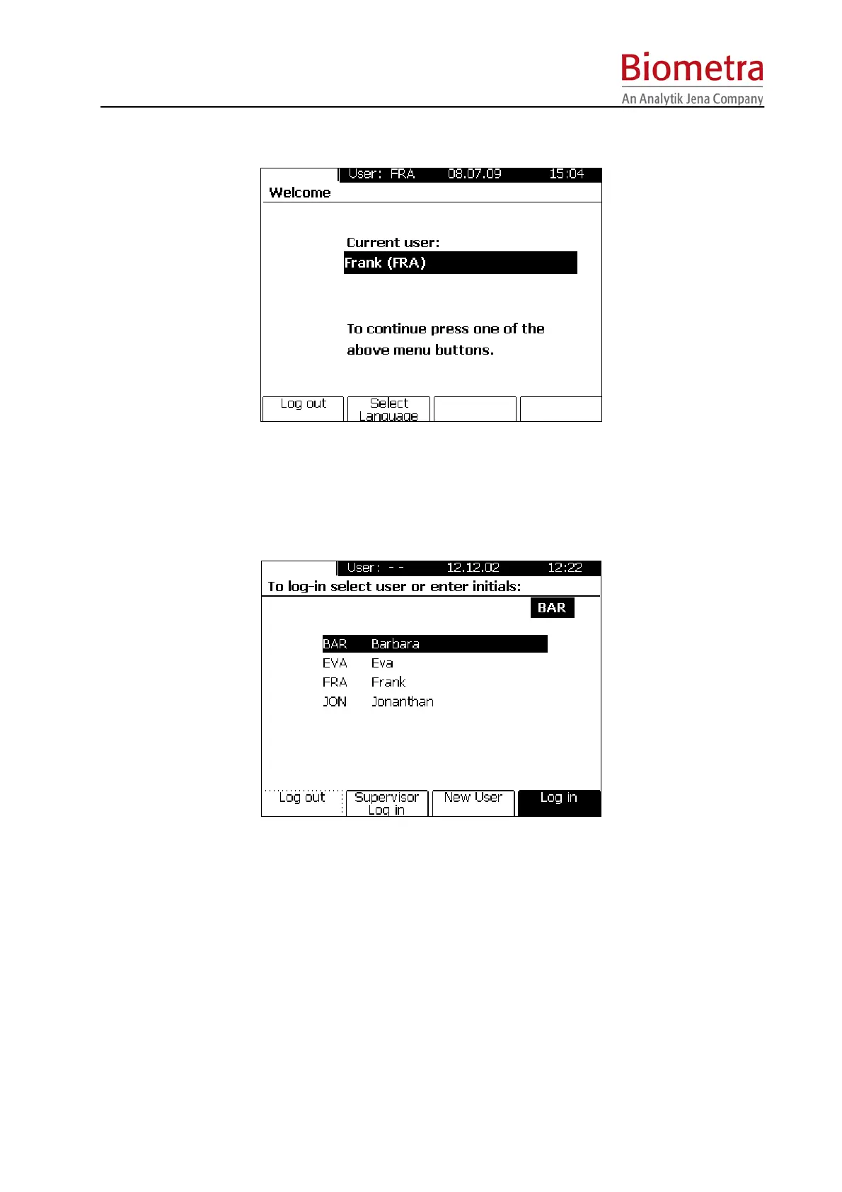 Confirm PIN with button [PIN code ok]. The current User is shown: