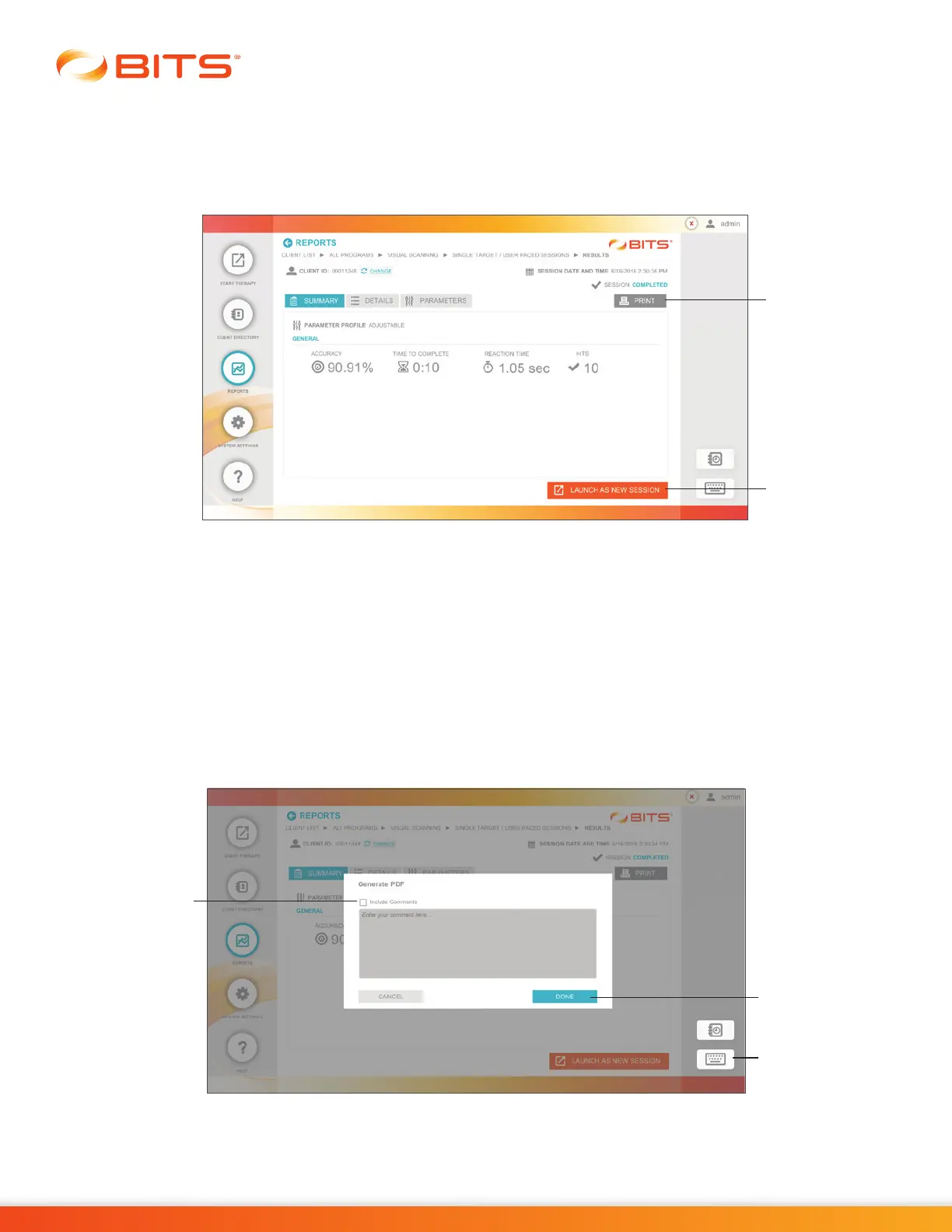 Therapy results displayed on the Results Screens in the Reports Module and at the end of each therapy