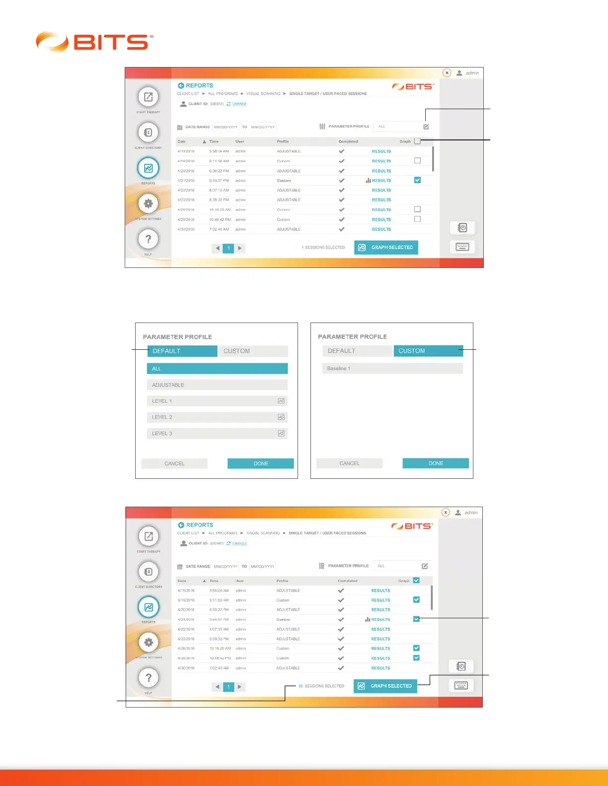 Note: The Sessions Results List can also be filtered by Default or Custom Parameter Profiles by pressing