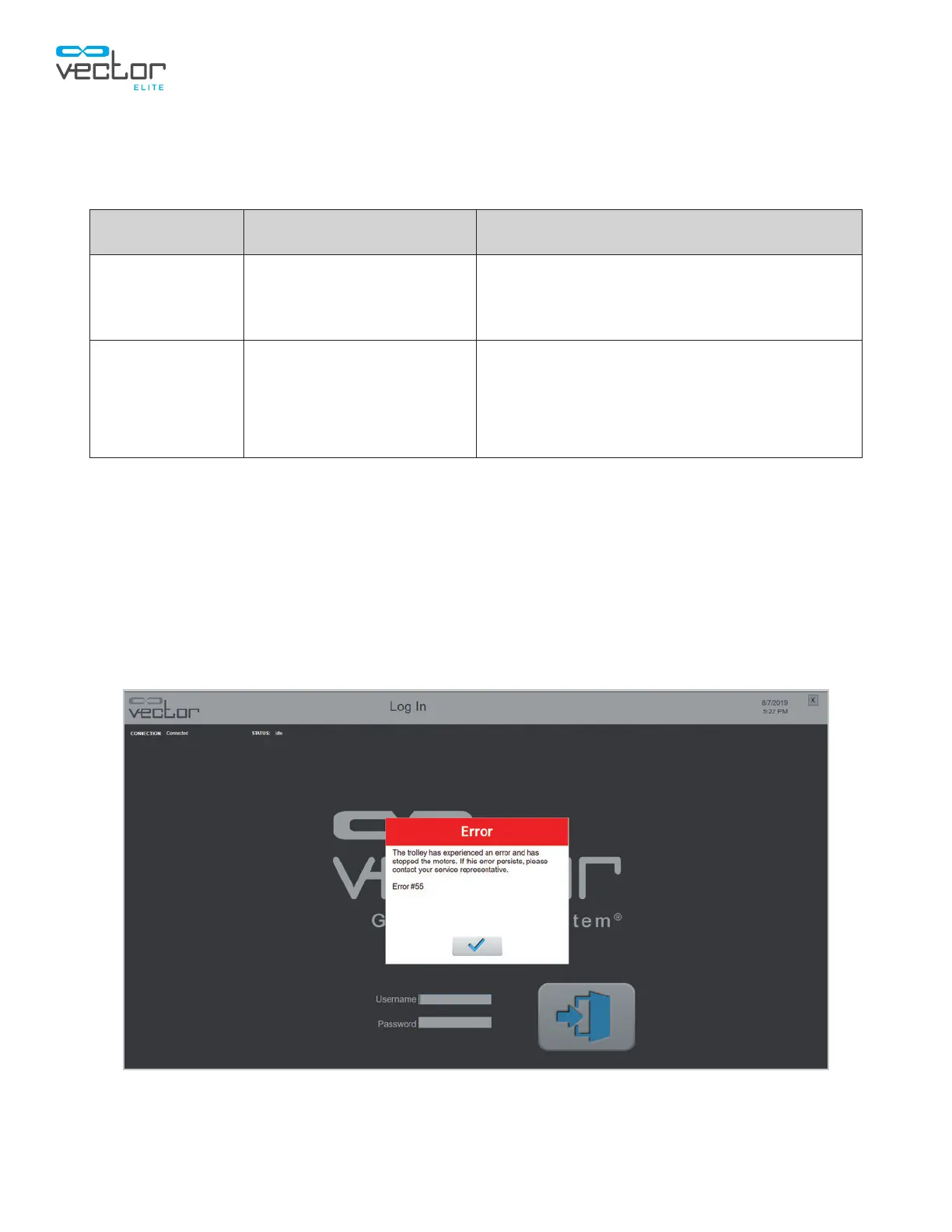 When a trolley error is detected, an Error Code will appear. These errors will cause the Vector Elite