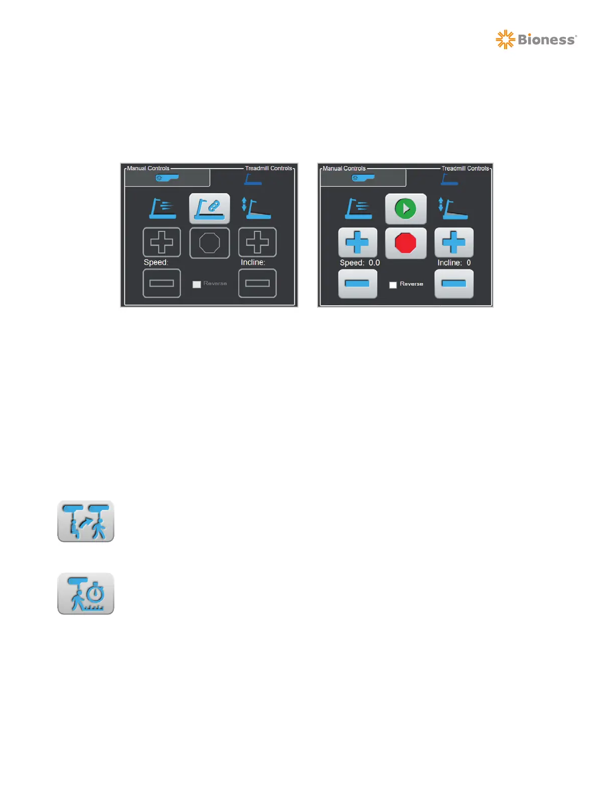 connecting the treadmill to the Vector software, controls for start, stop, speed, incline, and belt direction