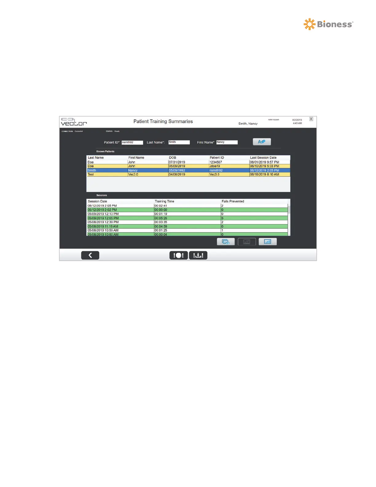 1. To open the Patient Training Summaries screen and view training session data from any patient,