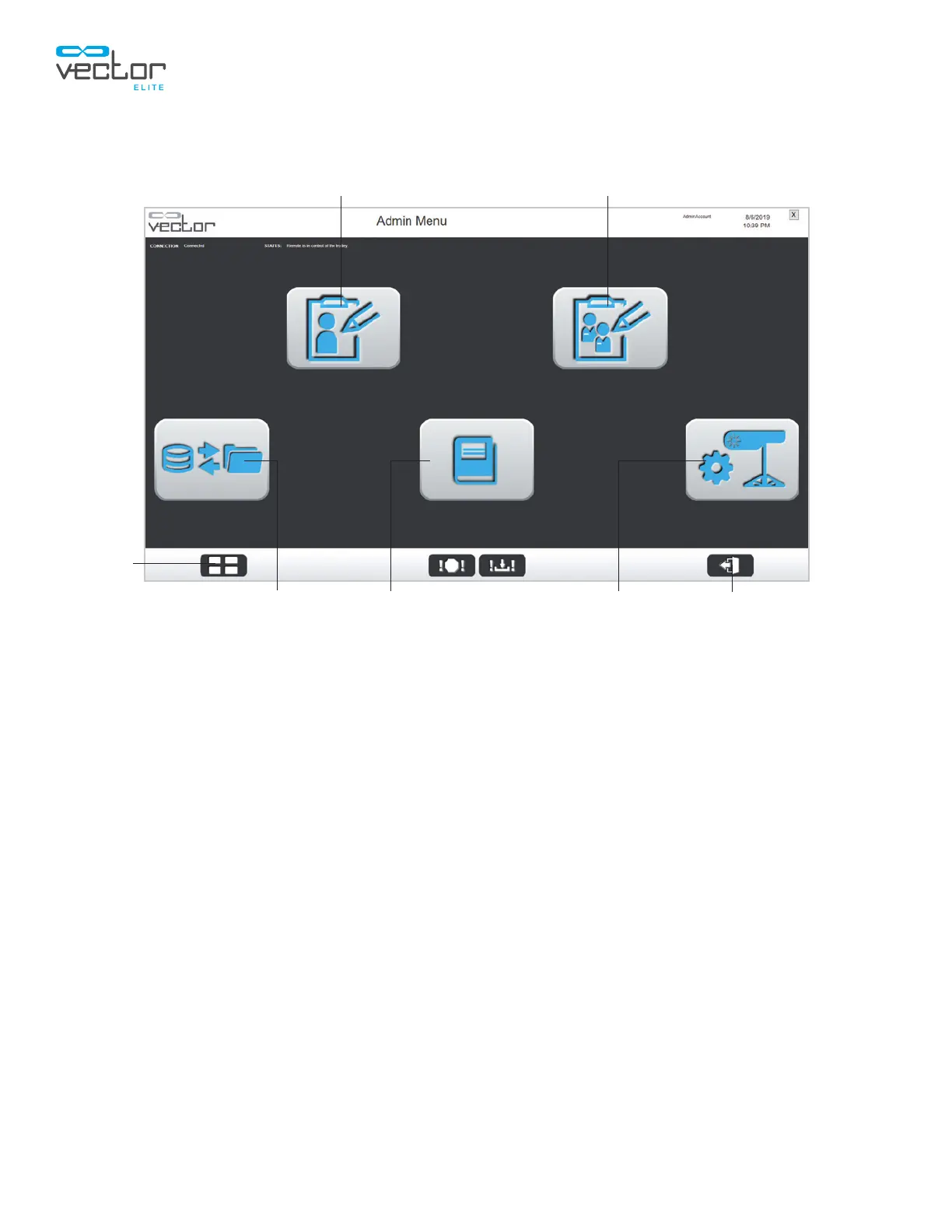 The Vector Elite Admin Menu screen has five menu options that appear as buttons with descriptive