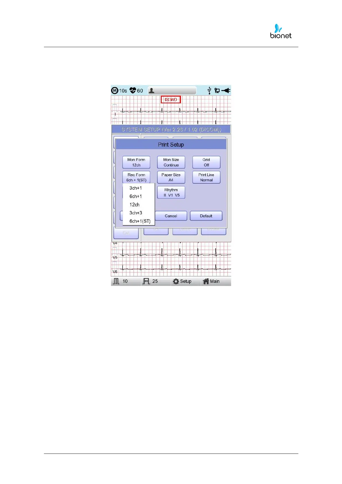 - ‘12CH’: 12-channel rhythm will be recorded as I, II, III, aVR, aVL, aVF, V1, V2, V3, V4,