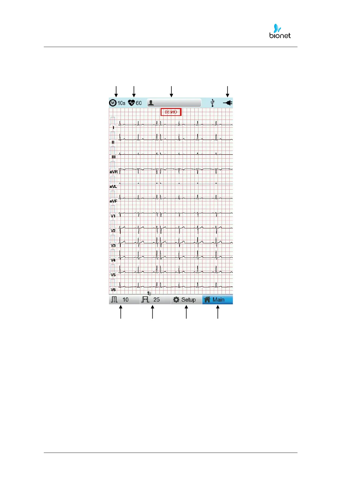 ①Select one ECG recording mode (10s, 1m, 3m, 5m, or 10m (seconds, minutes))