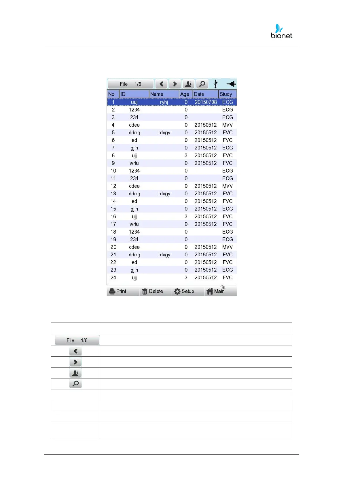 The following is the main page of ECG file management, shown when selecting