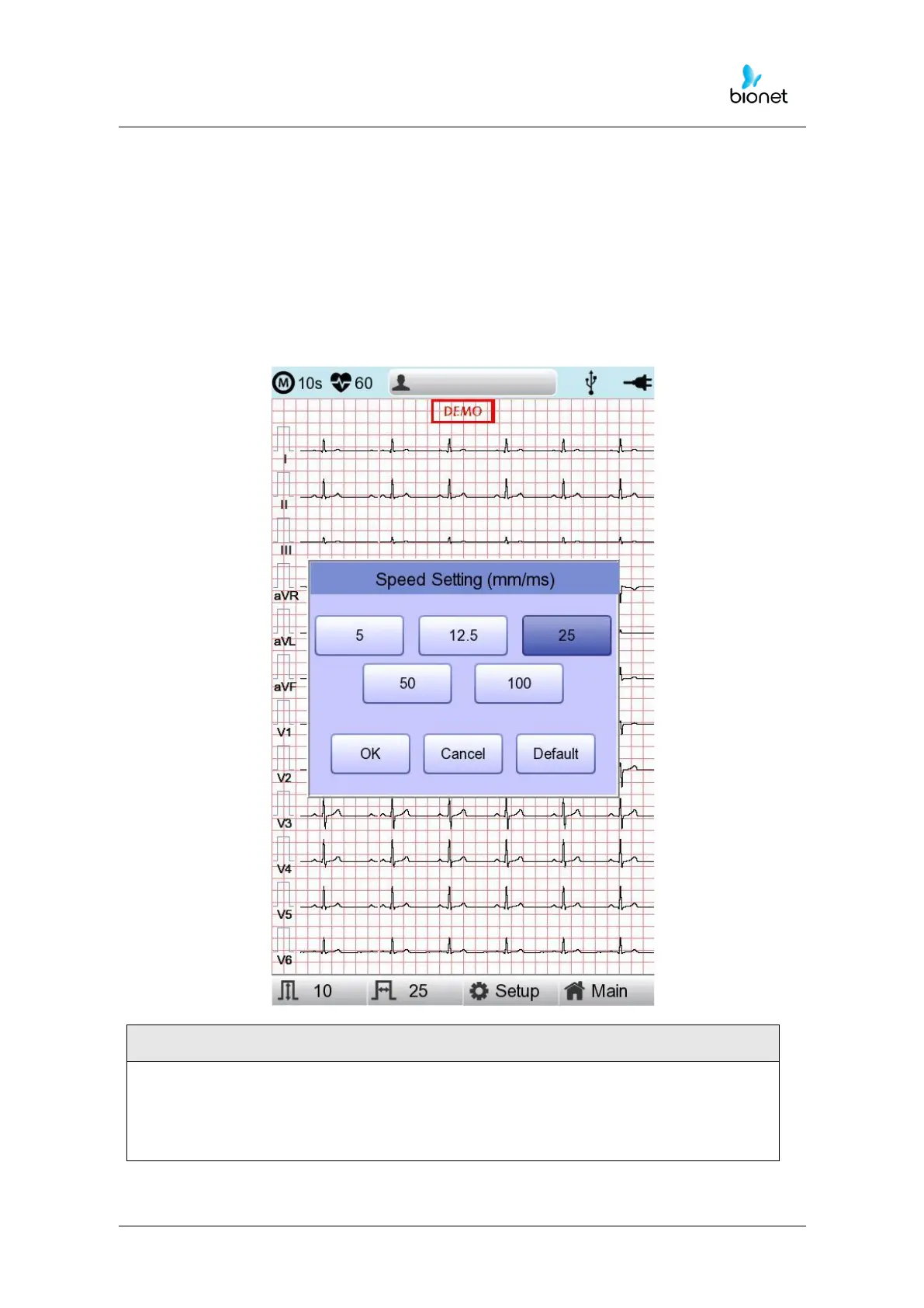 in 12.5mm/sec, 25mm/sec and 50mm/sec. If you set 25mm/sec up, the ECG signal