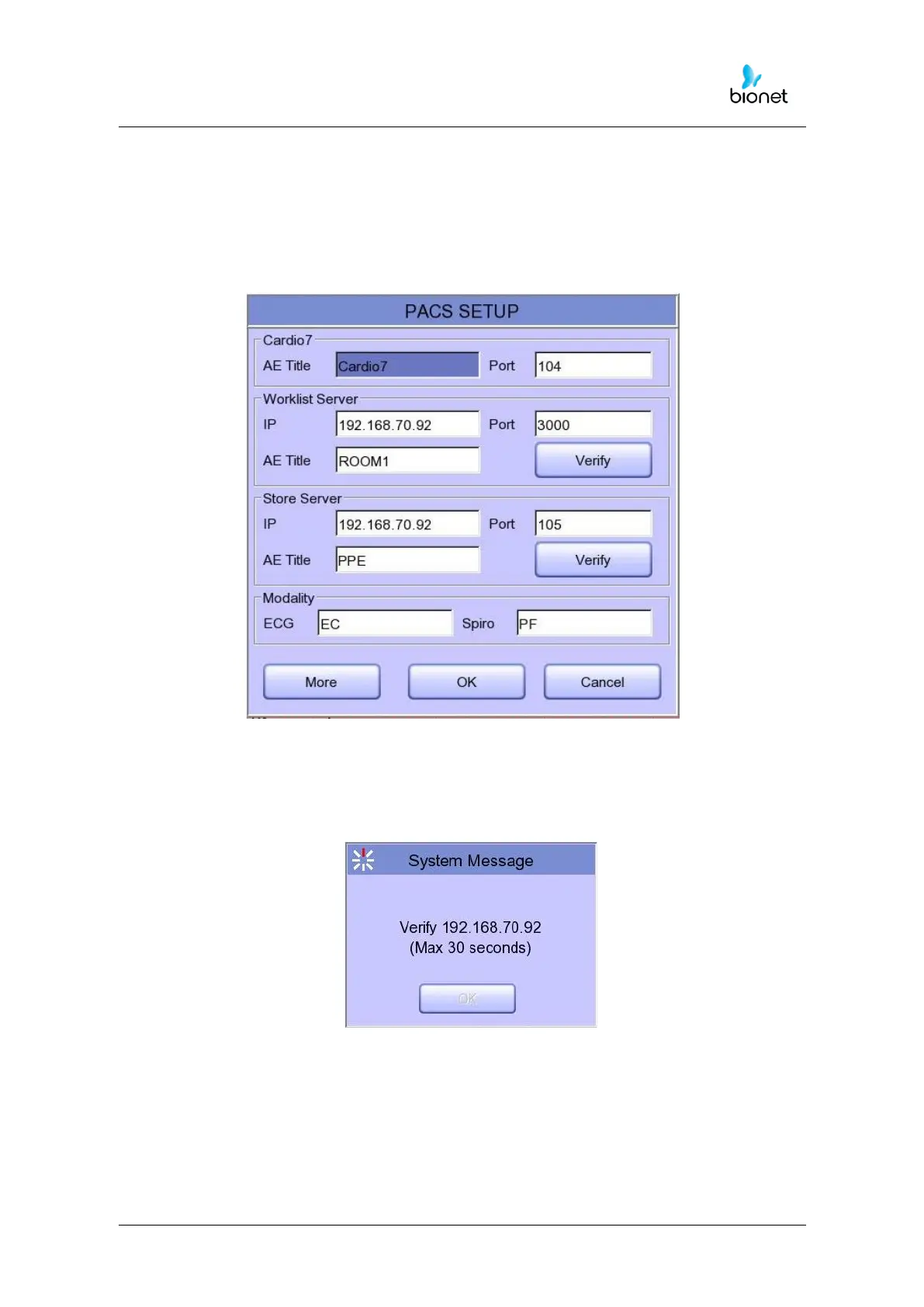 The screen for related settings such as the AE Title, IP and Port of Cardio7e/Cardio7, Worklist