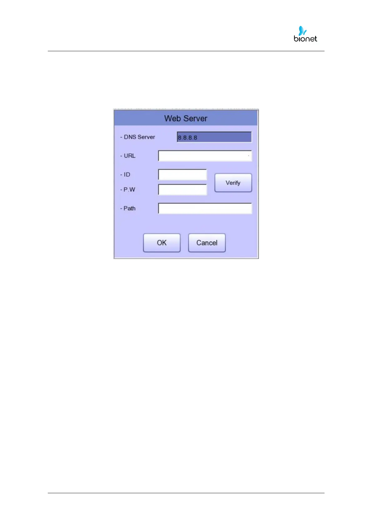 The screen for related settings such as DNS Server, URL, ID, PW, Path appears.