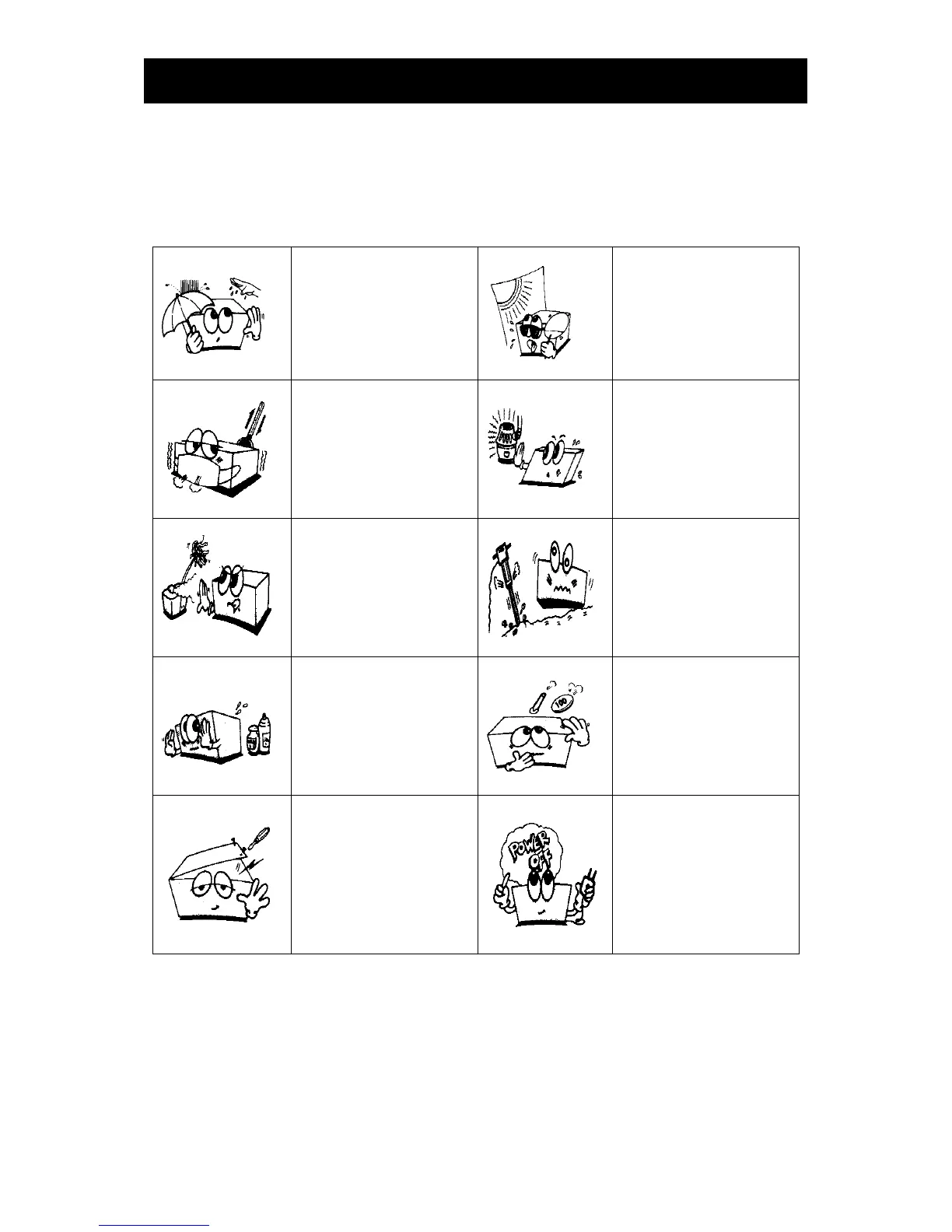 Do not keep or operate the equipment in the environment listed below.