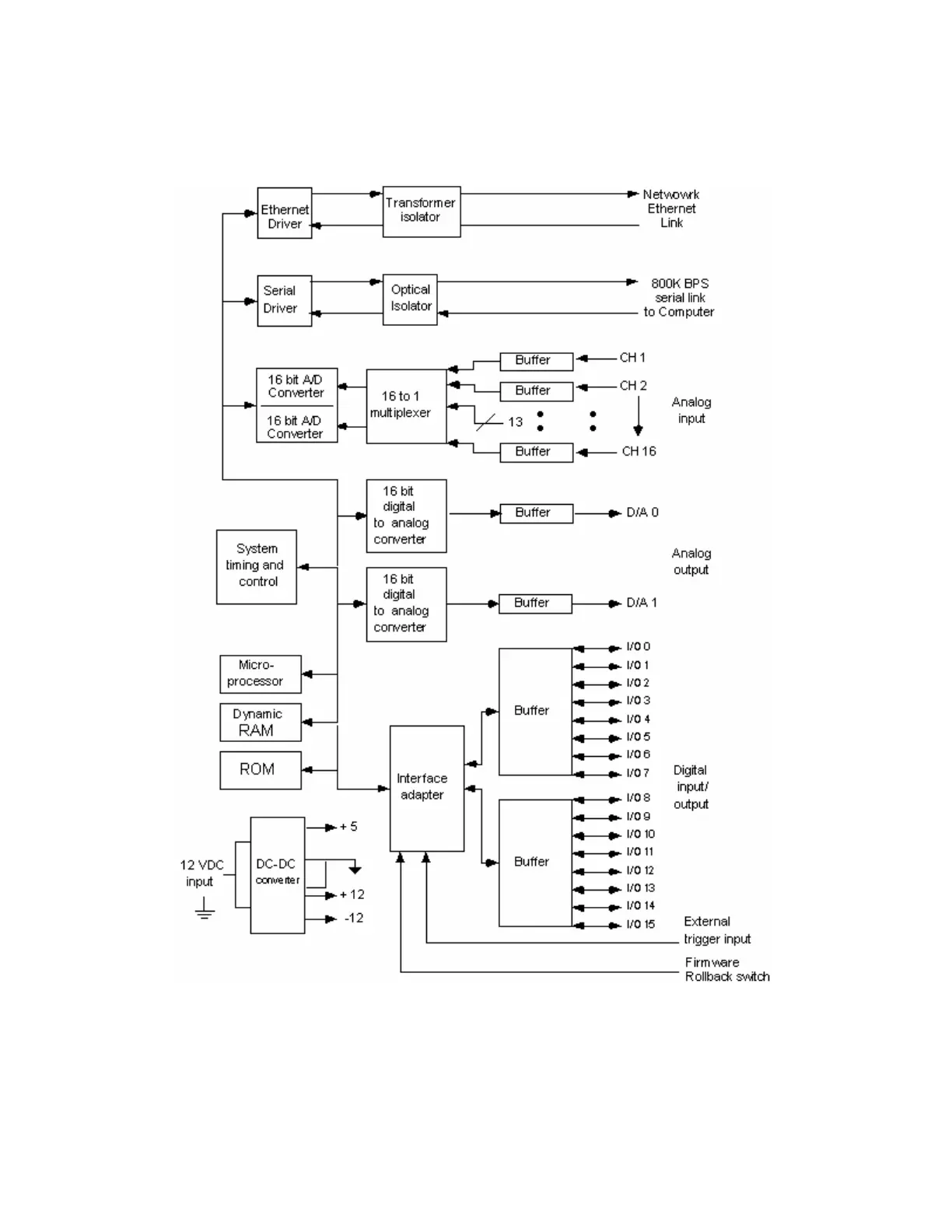 There are 16 analog input channels, two analog output channels, 16 digital channels that can be used for either input