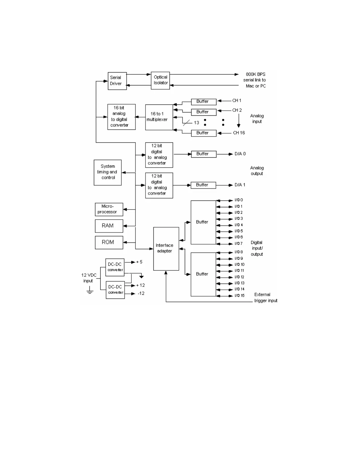 There are 16 analog input channels, two analog output channels, 16 digital channels that can be used for either input