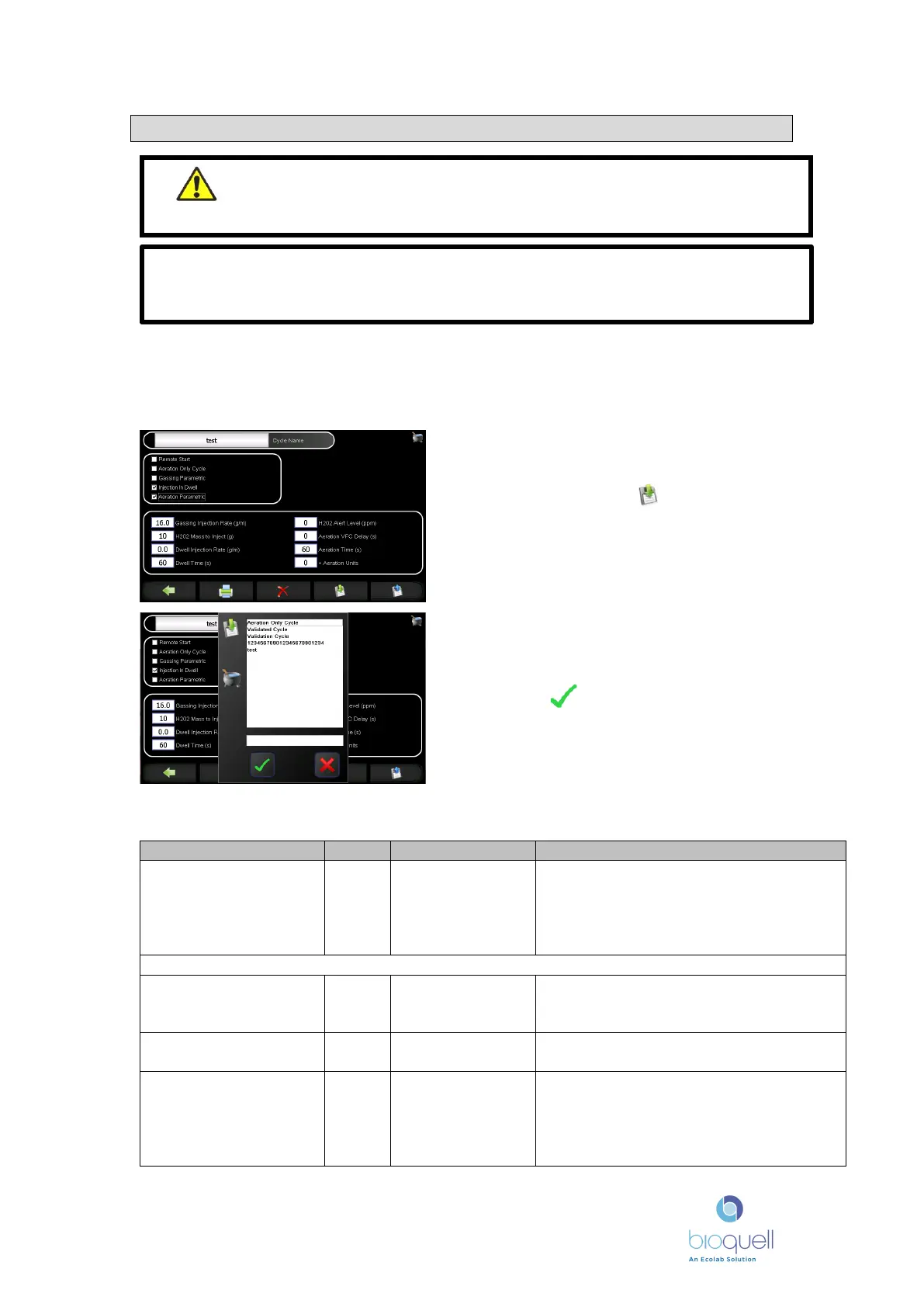 The following table details the cycle parameters that can be altered: