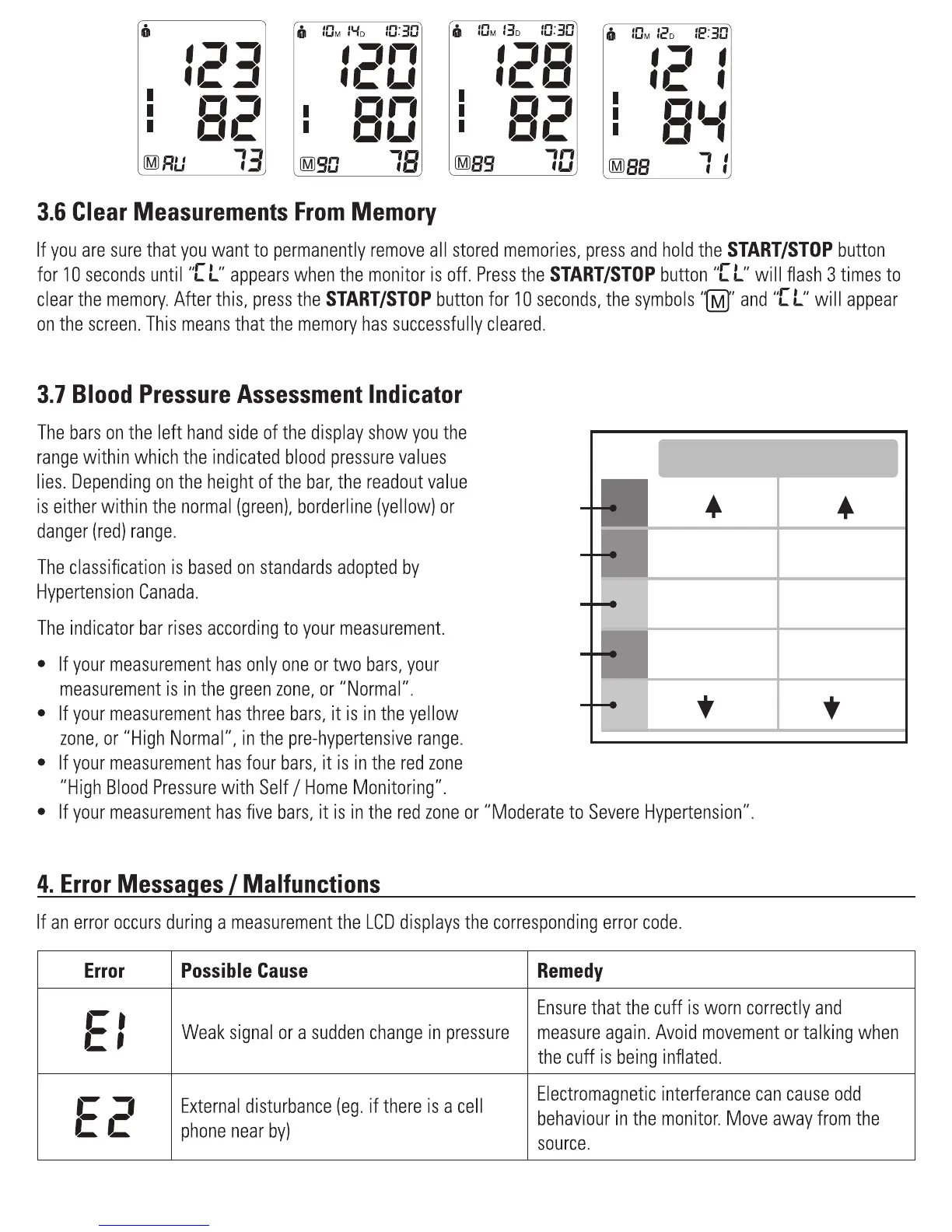 BIOS Diagnostics BD230 - 3.7 Blood Pressure Assessment Indicator; 4. Error Messages; Malfunctions; Error Codes