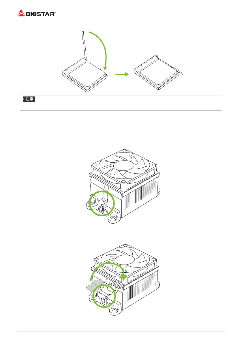 步骤2: 将另一边的固定夹向下压,扣住支架上的塑胶凸耳。然后固定,使风扇和散热片