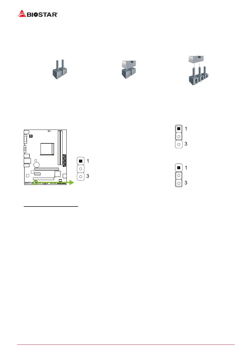 The illustraon shows how to set up jumpers. When the jumper cap is placed on pins, the