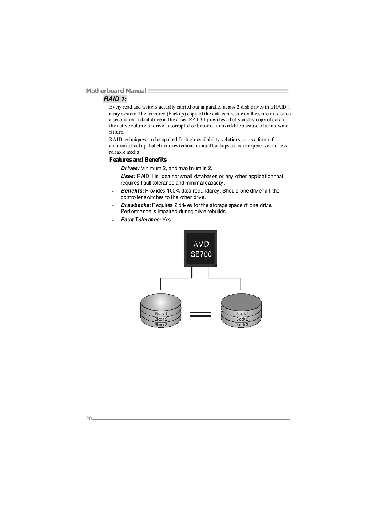 - Benefits: Prov ides 100% data redundancy. Should one drive fail, the