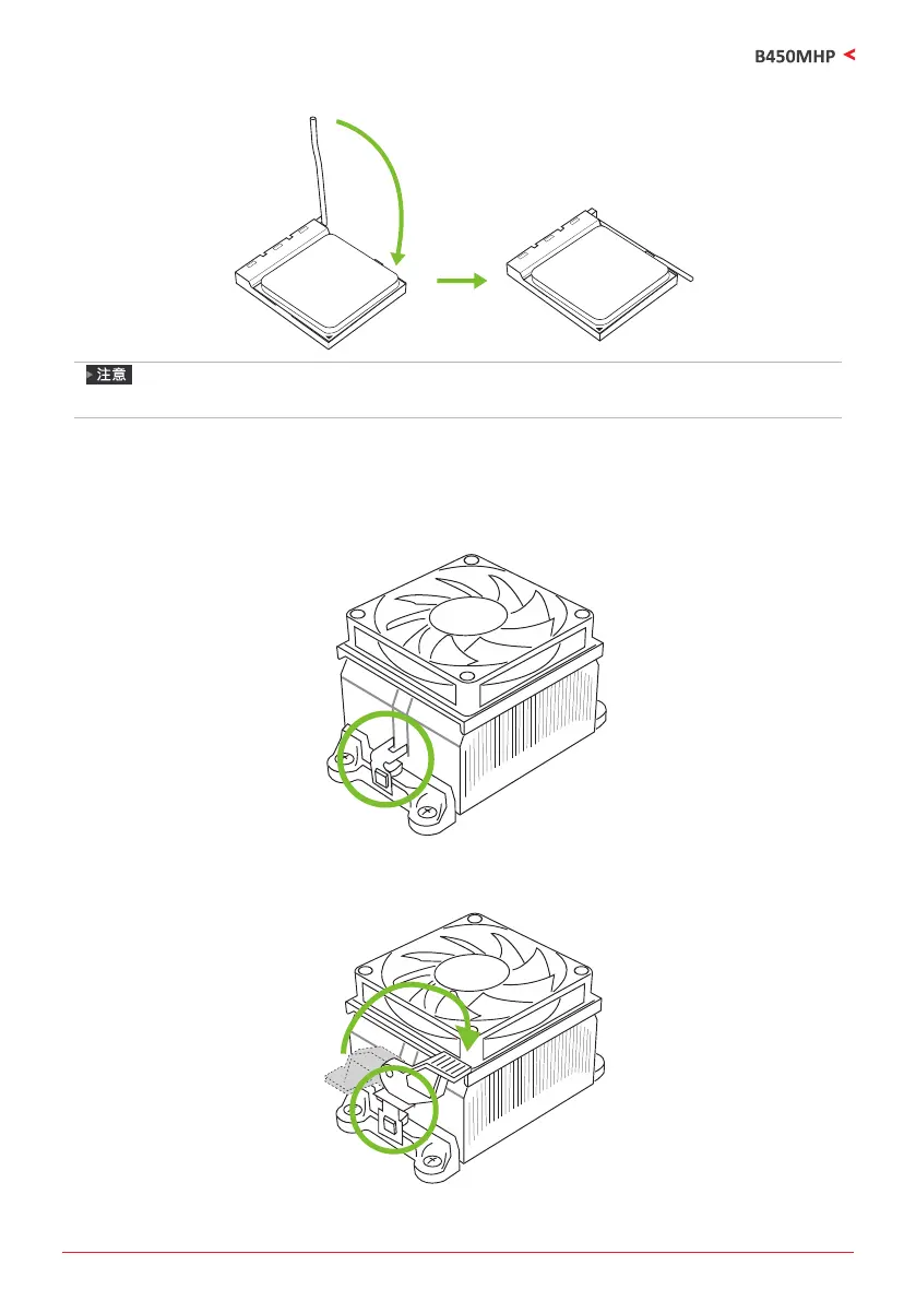 步驟2: 將另一邊的固定夾向下壓,扣住支架上的塑膠凸耳。然後固定,使風扇和散熱片