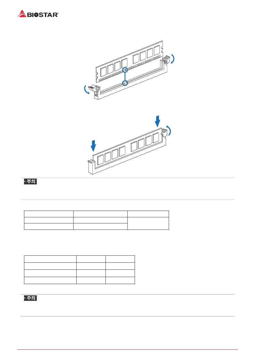 용량의 메모리 한 짝(2개를 아래의표와 같이 설치하여 주십시오.