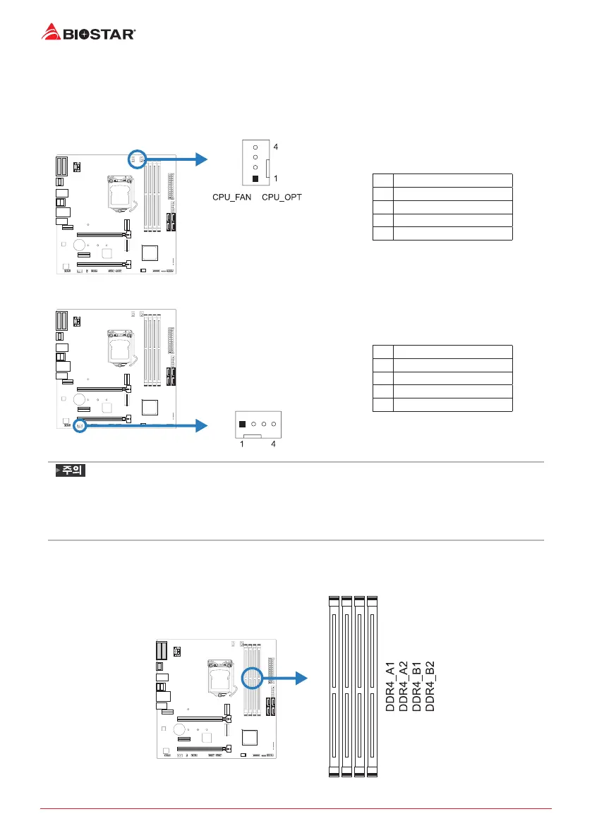 » CPU_FAN, CPU_OPT, SYS_FAN1 은4-pin과3-pin 헤드 커넥터를 지원합니다. 커넥터에 전선을