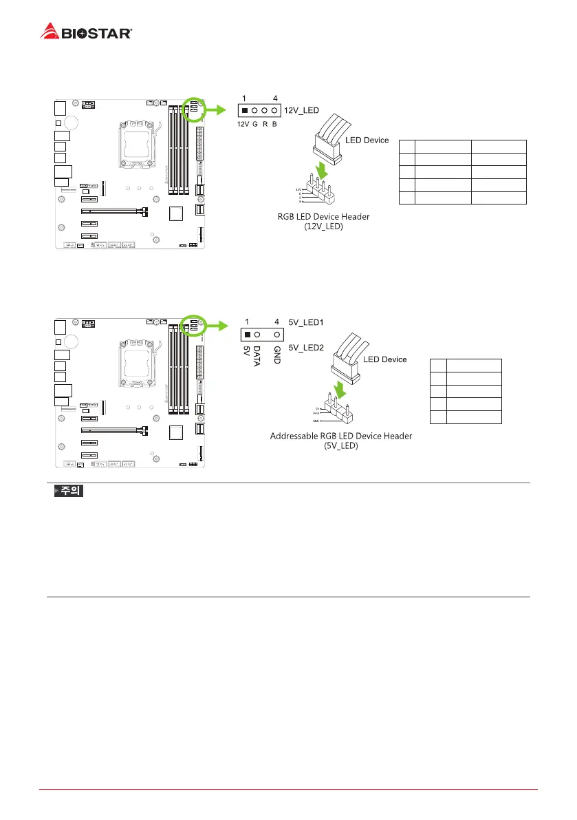 LED 장치에 연결할 때 핀을 올바르게 연결했는지 확인하여 주십시오. 잘못된 연결은 LED