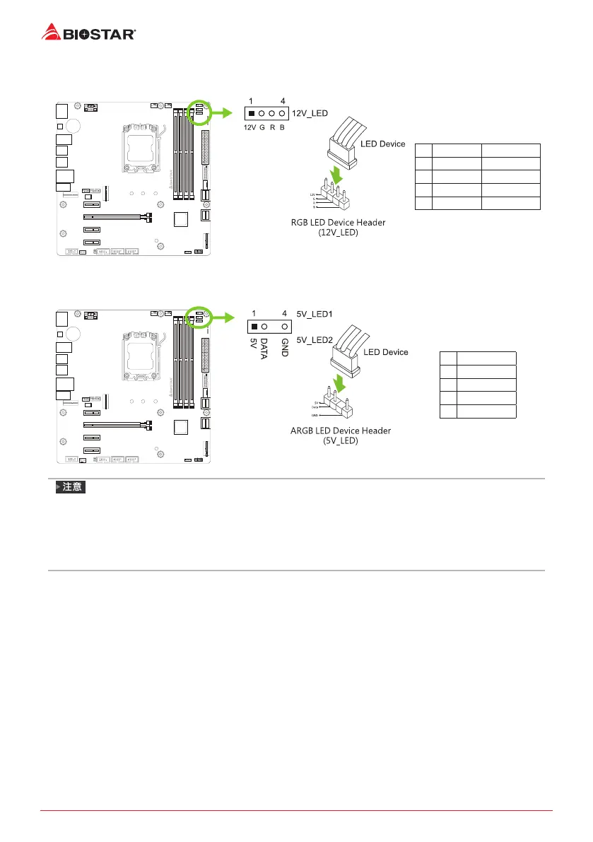 請確保並正確的將針腳連接至LED裝置,錯誤的連接可能會損壞您的LED裝置或主板。